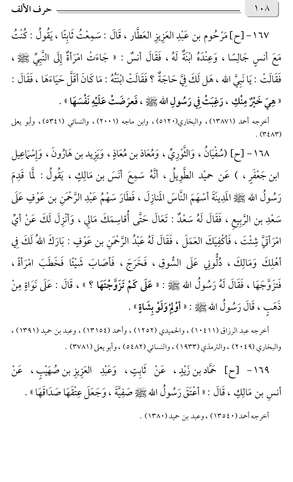 ١٦٩ - [ح] حَمَّاد بن زَيْدٍ، عَنْ ثَابِتٍ، وَعَبْدِ العَزِيزِ بن صُهَيْبٍ، عَنْ أنسِ بن مَالِكٍ، قَالَ: «أعْتَقَ رَسُولُ الله صلى الله عليه وسلم صَفِيَّةَ، وَجَعَلَ عِتْقَهَا صَدَاقَهَا":