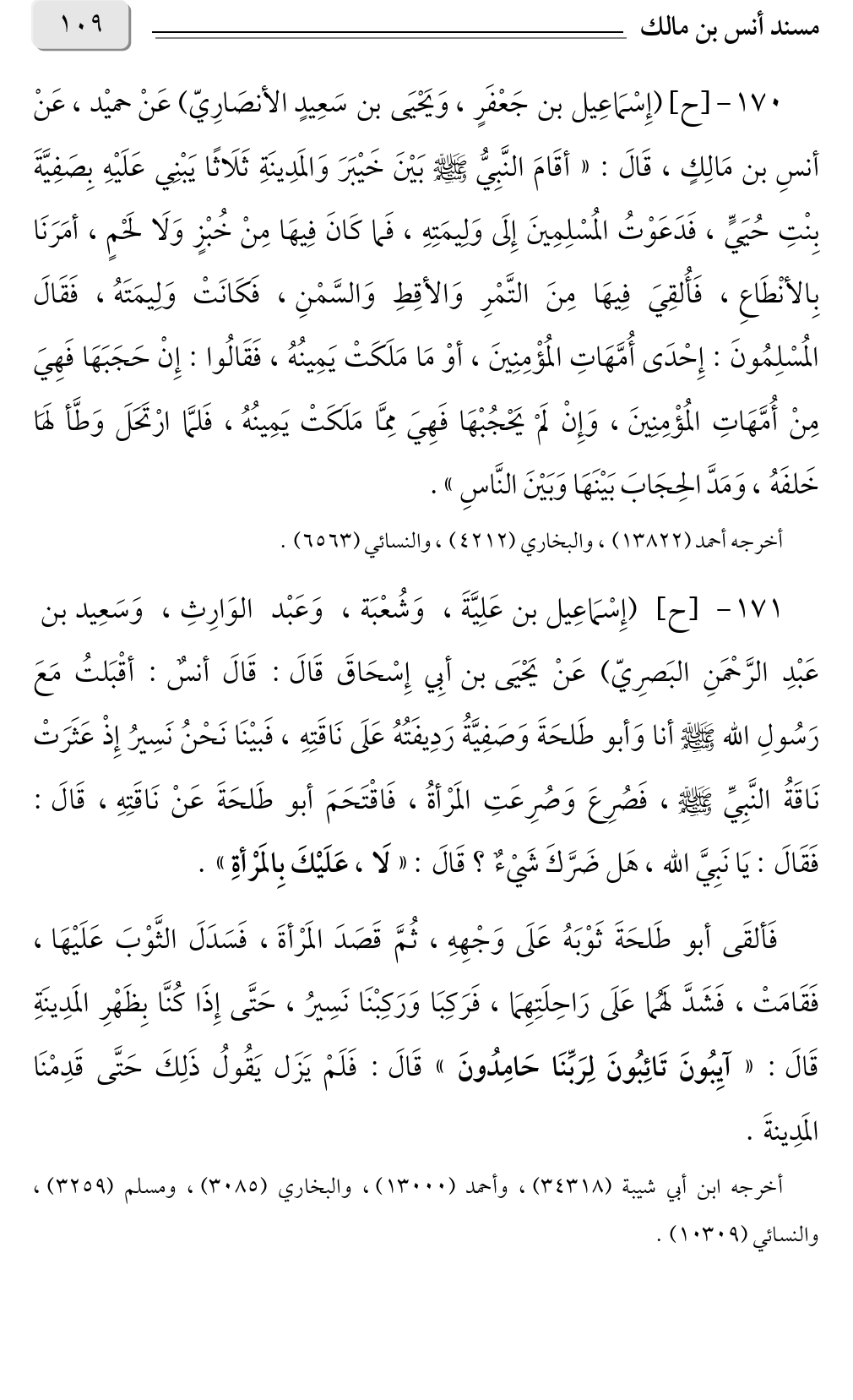 ١٧٠ - [ح] (إِسْمَاعِيل بن جَعْفَرٍ، وَيَحْيَى بن سَعِيدٍ الأنصَارِيّ) عَنْ حميْد، عَنْ أنسِ بن مَالِكٍ، قَالَ: «أقَامَ النَّبِيُّ صلى الله عليه وسلم بَيْنَ خَيْبَرَ وَالمَدِينَةِ ثَلَاثًا يَبْنِي عَلَيْهِ بِصَفِيَّةَ بِنْتِ حُيَيٍّ، فَدَعَوْتُ المُسْلِمِينَ إِلَى وَلِيمَتِهِ، فَما كَانَ فِيهَا مِنْ خُبْزٍ وَلَا لَحْمٍ، أمَرَنَا بِالأنْطَاعِ، فَأُلقِيَ فِيهَا مِنَ التَّمْرِ وَالأقِطِ وَالسَّمْنِ، فَكَانَتْ وَلِيمَتَهُ، فَقَالَ المُسْلِمُونَ: إِحْدَى أُمَّهَاتِ المُؤْمِنِينَ، أوْ مَا مَلَكَتْ يَمِينُهُ، فَقَالُوا: إِنْ حَجَبَهَا فَهِيَ مِنْ أُمَّهَاتِ المُؤْمِنِينَ، وَإِنْ لَمْ يَحْجُبْهَا فَهِيَ مِمَّا مَلَكَتْ يَمِينُهُ، فَلمَّا ارْتَحَلَ وَطَّأ لَهَا خَلفَهُ، وَمَدَّ الحِجَابَ بَيْنَهَا وَبَيْنَ النَّاسِ».