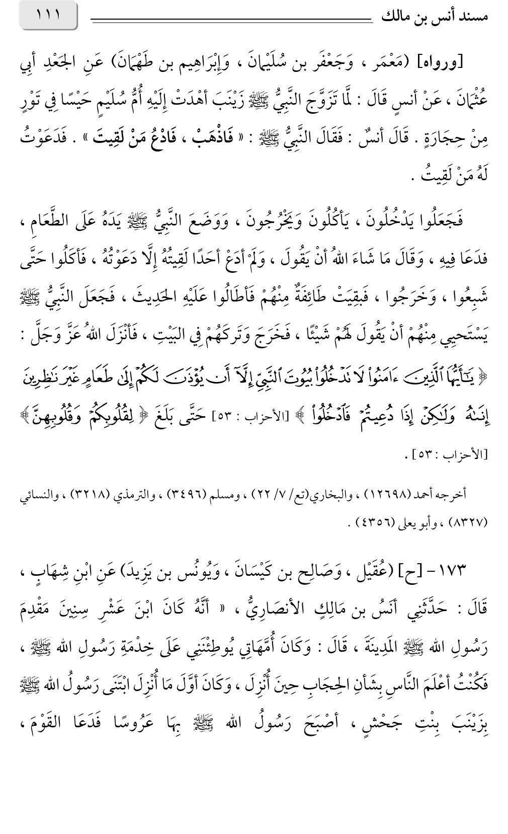 ١٧٣ - [ح] (عُقَيْل، وَصَالِح بن كَيْسَانَ، وَيُونُس بن يَزِيدَ) عَنِ ابْنِ شِهَابٍ، قَالَ: حَدَّثَنِي أنَسُ بن مَالِكٍ الأنصَارِيُّ، «أنَّهُ كَانَ ابْنَ عَشْرِ سِنِينَ مَقْدِمَ رَسُولِ الله صلى الله عليه وسلم المَدِينَةَ، قَالَ: وَكَانَ أُمَّهَاتِي يُوطِئْنَنِي عَلَى خِدْمَةِ رَسُولِ الله صلى الله عليه وسلم، فَكُنْتُ أعْلَمَ النَّاسِ بِشَأنِ الحِجَابِ حِينَ أُنْزِلَ، وَكَانَ أوَّلَ مَا أُنْزِلَ ابْتَنَى رَسُولُ الله صلى الله عليه وسلم بِزَيْنَبَ بِنْتِ جَحْشٍ، أصْبَحَ رَسُولُ الله صلى الله عليه وسلم بِهَا عَرُوسًا فَدَعَا القَوْمَ،