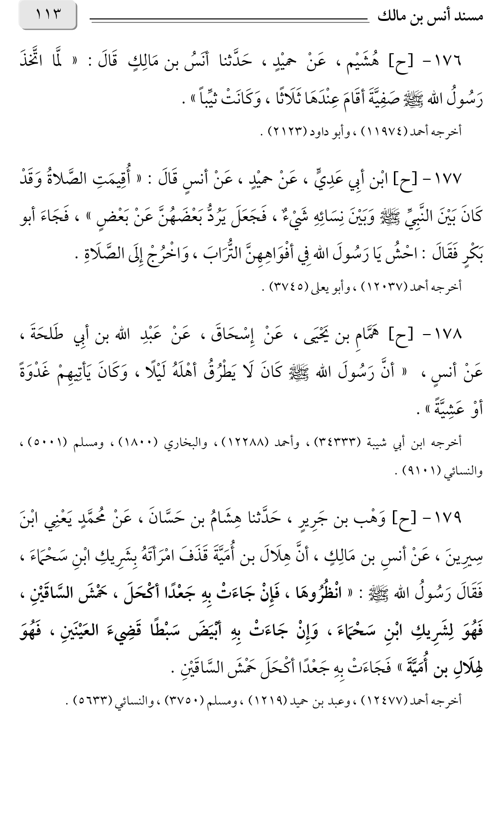 ١٧٦ - [ح] هُشَيْم، عَنْ حميْدٍ، حَدَّثنا أنَسُ بن مَالِكٍ قَالَ: «لمَّا اتَّخذَ رَسُولُ الله صلى الله عليه وسلم صَفِيَّةَ أقَامَ عِنْدَهَا ثَلَاثًا، وَكَانَتْ ثيِّبًا».