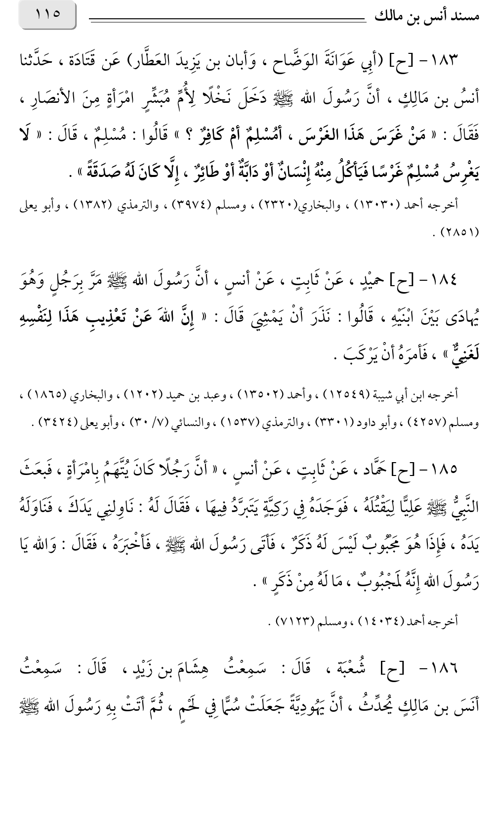 ١٨٣ - [ح] (أبِي عَوَانَةَ الوَضَّاح، وَأبان بن يَزِيدَ العَطَّار) عَن قَتَادَة، حَدَّثنا أنسُ بن مَالِكٍ، أنَّ رَسُولَ الله صلى الله عليه وسلم دَخَلَ نَخْلًا لِأُمِّ مُبَشِّرٍ امْرَأةٍ مِنَ الأنصَارِ، فَقَالَ: «مَنْ غَرَسَ هَذَا الغَرْسَ، أمُسْلِمٌ أمْ كَافِرٌ؟ » قَالُوا: مُسْلِمٌ، قَالَ «لَا يَغْرِسُ مُسْلِمٌ غَرْسًا فَيَأكُلُ مِنْهُ إِنْسَانٌ أوْ دَابَّةٌ أوْ طَائِرٌ، إِلَّا كَانَ لَهُ صَدَقَةً».