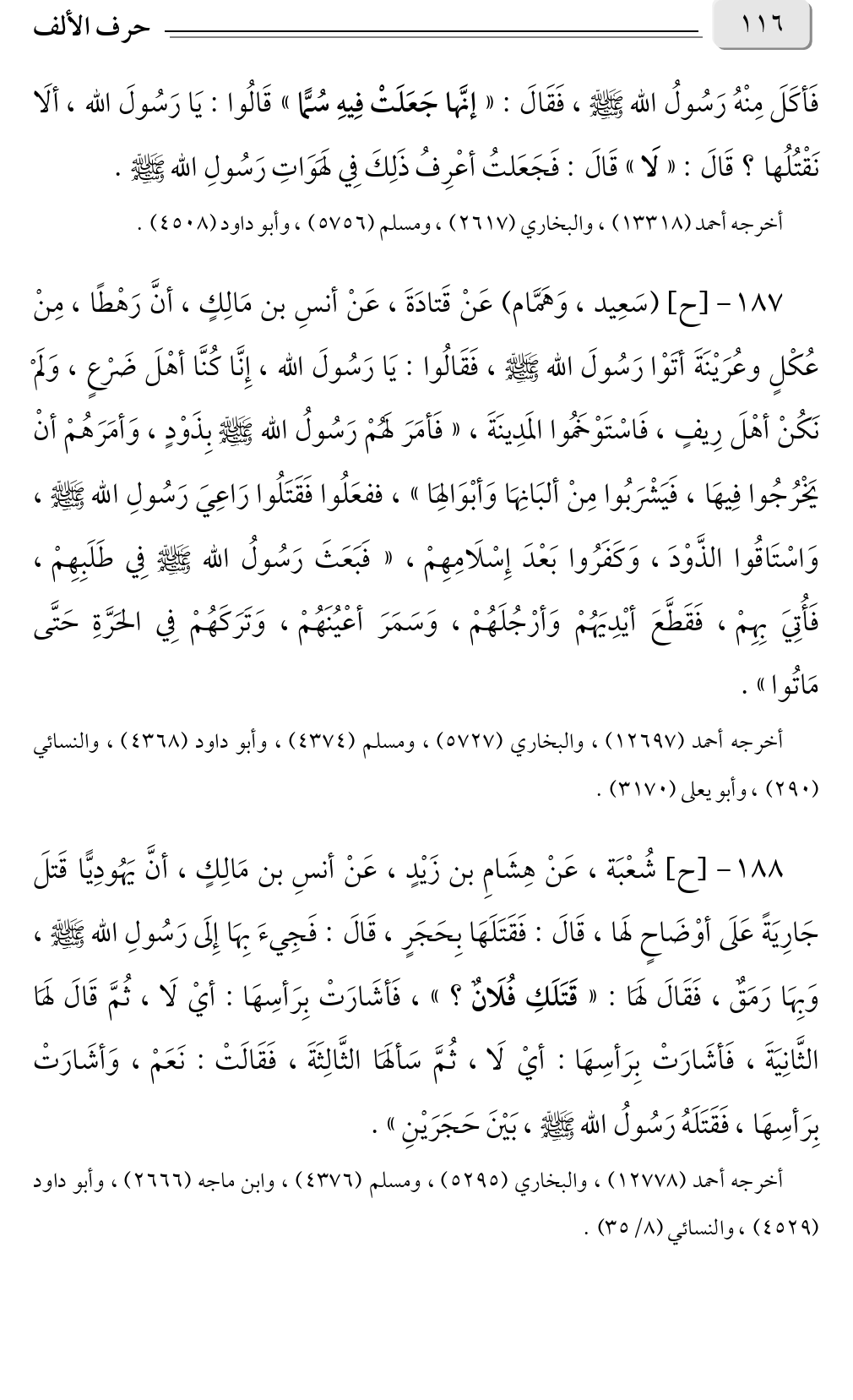 ١٨٨ - [ح] شُعْبَة، عَنْ هِشَامِ بن زَيْدٍ، عَنْ أنسِ بن مَالِكٍ، أنَّ يَهُودِيًّا قَتلَ جَارِيَةً عَلَى أوْضَاحٍ لَها، قَالَ: فَقَتَلَهَا بِحَجَرٍ، قَالَ: فَجِيءَ بِهَا إِلَى رَسُولِ الله صلى الله عليه وسلم، وَبِهَا رَمَقٌ، فَقَالَ لَهَا: «قَتَلَكِ فُلَانٌ؟ » فَأشَارَتْ بِرَأسِهَا: أيْ لَا، ثُمَّ قَالَ لَهَا الثَّانِيَةَ، فَأشَارَتْ بِرَأسِهَا: أيْ لَا، ثُمَّ سَألَهَا الثَّالِثَةَ، فَقَالَتْ: نَعَمْ، وَأشَارَتْ بِرَأسِهَا، فَقَتَلَهُ رَسُولُ الله صلى الله عليه وسلم، بَيْنَ حَجَرَيْنِ».