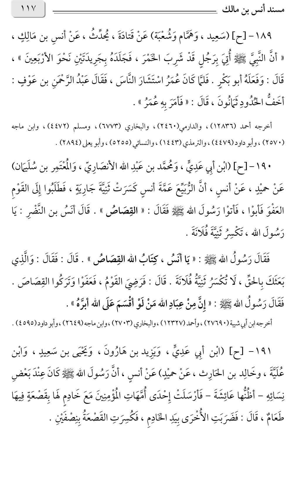 ١٩٠ - [ح] (ابْن أبِي عَدِيٍّ، وَمُحمَّد بن عَبْدِ الله الأنصَارِيّ، وَالمُعْتَمِر بن سُلَيمَان) عَنْ حميْدٍ، عَنْ أنسٍ، أنَّ الرُّبَيِّعَ عَمَّةَ أنسٍ كَسَرَتْ ثَنِيَّةَ جَارِيَةٍ، فَطَلَبُوا إِلَى القَوْمِ العَفْوَ فَأبوْا، فَأتوْا رَسُولَ الله صلى الله عليه وسلم فَقَالَ: «القِصَاصُ». قَالَ أنَسُ بن النَّضْرِ: يَا رَسُولَ الله، تَكْسِرُ ثَنِيَّةَ فُلَانَةَ.