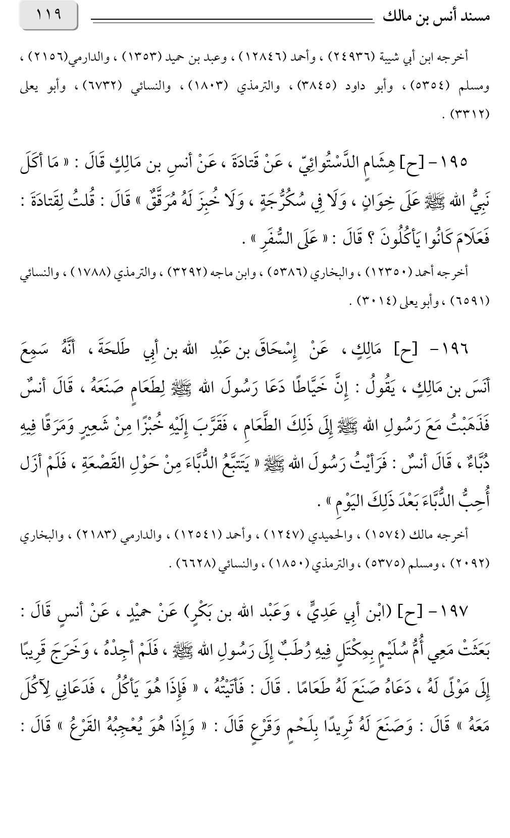 ١٩٧ - [ح] (ابْن أبِي عَدِيٍّ، وَعَبْد الله بن بَكْرٍ) عَنْ حميْدٍ، عَنْ أنسٍ قَالَ: بَعَثَتْ مَعِي أُمُّ سُلَيْمٍ بِمِكْتَلٍ فِيهِ رُطَبٌ إِلَى رَسُولِ الله صلى الله عليه وسلم، فَلَمْ أجِدْهُ، وَخَرَجَ قَرِيبًا إِلَى مَوْلًى لَهُ، دَعَاهُ صَنَعَ لَهُ طَعَامًا. قَالَ: فَأتَيْتُهُ، «فَإِذَا هُوَ يَأكُلُ، فَدَعَانِي لِآكُلَ مَعَهُ» قَالَ: وَصَنَعَ لَهُ ثَرِيدًا بِلَحْمٍ وَقَرْعٍ قَالَ: «وَإِذَا هُوَ يُعْجِبُهُ القَرْعُ»: قَالَ: