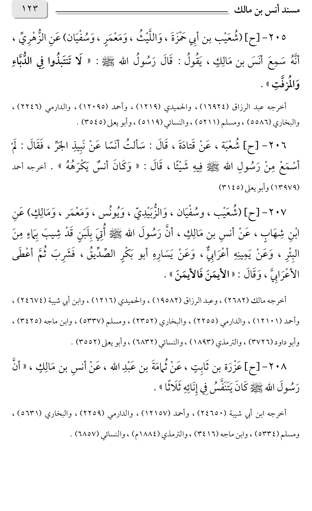 ٢٠٥ - [ح] (شُعَيْب بن أبِي حَمْزَةَ، وَاللَّيْثُ، وَمَعْمَرٍ، وَسُفْيَان) عَنِ الزُّهْرِيِّ، أنَّهُ سَمِعَ أنَسَ بن مَالِكٍ، يَقُولُ: قَالَ رَسُولُ الله صلى الله عليه وسلم: «لَا تَنتَبذُوا فِي الدُّبَّاءِ وَالمُزفَّتِ».