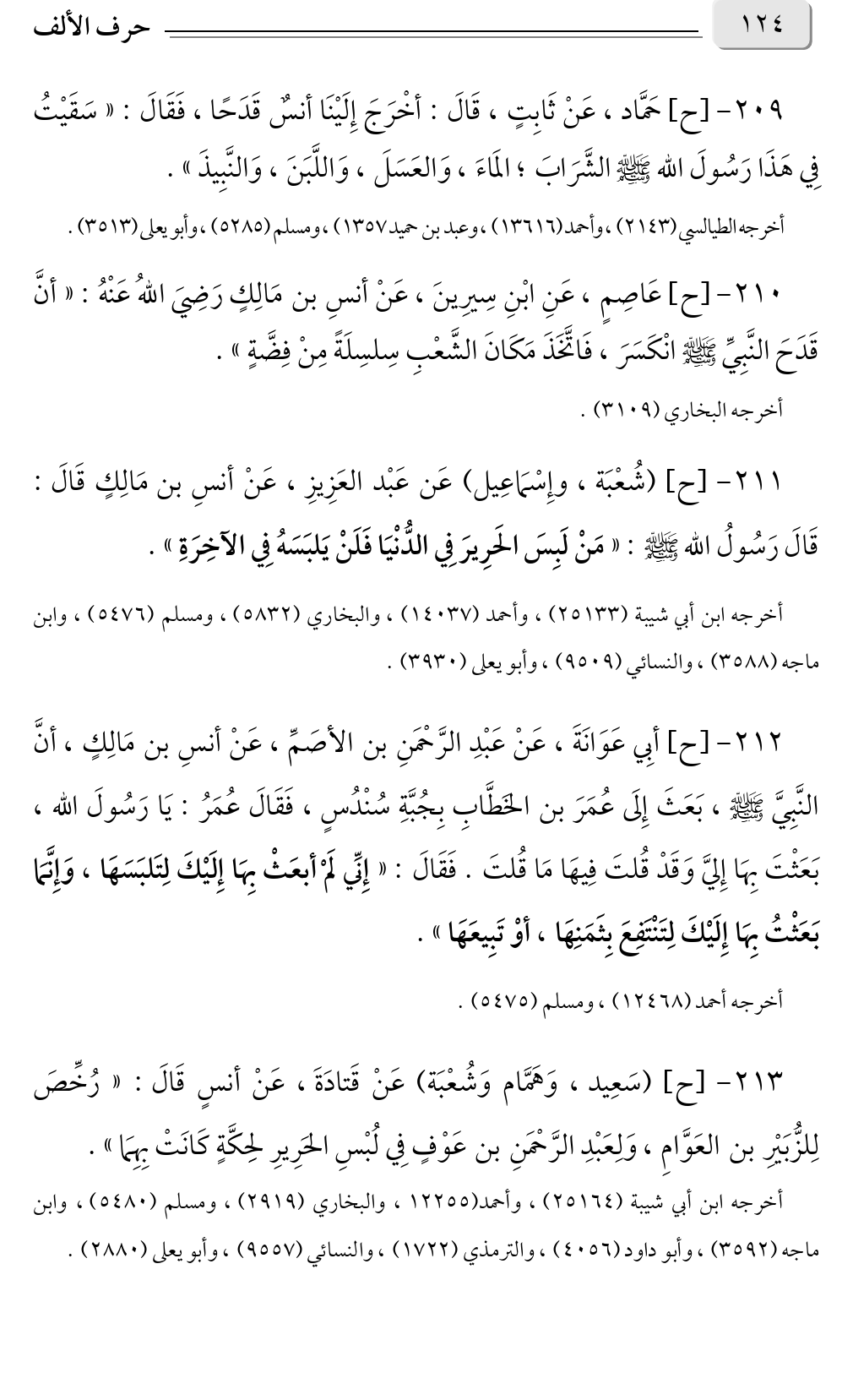 ٢١١ - [ح] (شُعْبَة، وإِسْمَاعِيل) عَن عَبْد العَزِيزِ، عَنْ أنسِ بن مَالِكٍ قَالَ: قَالَ رَسُولُ الله صلى الله عليه وسلم: «مَنْ لَبِسَ الحَرِيرَ فِي الدُّنْيَا فَلَنْ يَلبَسَهُ فِي الآخِرَةِ».