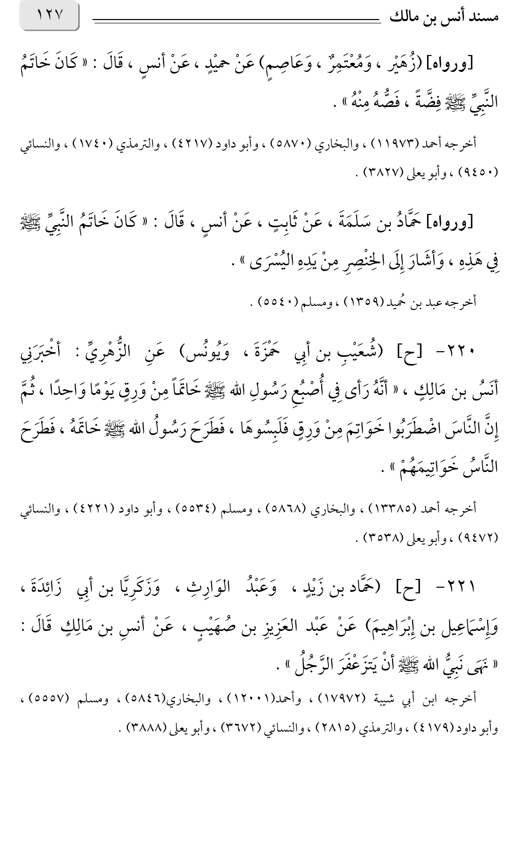 [ورواه] (زُهَيْر، وَمُعْتَمِرٌ، وَعَاصِمٍ) عَنْ حميْدٍ، عَنْ أنسٍ، قَالَ: «كَانَ خَاتَمُ النَّبِيِّ صلى الله عليه وسلم فِضَّةً، فَصُّهُ مِنْهُ».