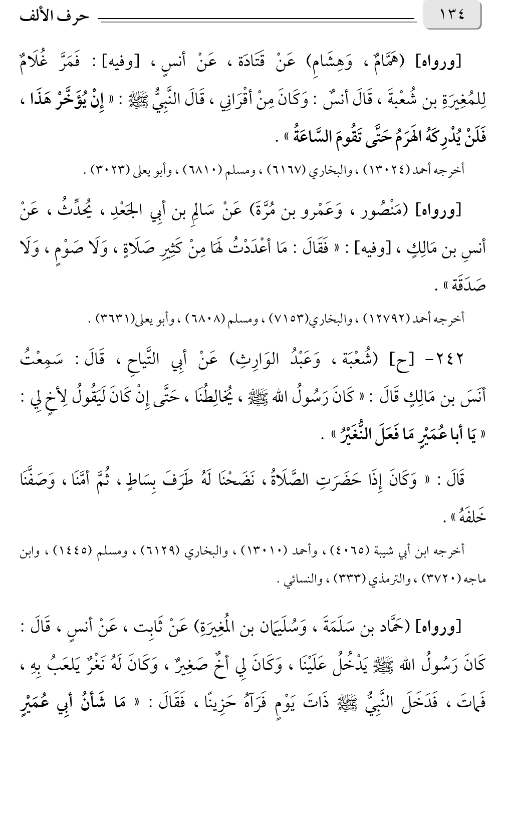٢٤٢ - [ح] (شُعْبَة، وَعَبْدُ الوَارِثِ) عَنْ أبِي التَّياحِ، قَالَ: سَمِعْتُ أنَسَ بن مَالِكٍ قَالَ: «كَانَ رَسُولُ الله صلى الله عليه وسلم، يُخالِطُنَا، حَتَّى إِنْ كَانَ لَيَقُولُ لِأخٍ لِي: «يَا أبا عُمَيْرٍ مَا فَعَلَ النُّغَيْرُ».