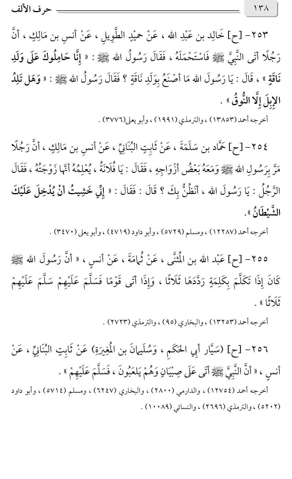 ٢٥٤ - [ح] حَمَّاد بن سَلَمَةَ، عَنْ ثَابِتٍ البُنَانِيِّ، عَنْ أنسِ بن مَالِكٍ، أنَّ رَجُلًا مَرَّ بِرَسُولِ الله صلى الله عليه وسلم وَمَعَهُ بَعْضُ أزْوَاجِهِ، فَقَالَ: يَا فُلَانَةُ، يُعْلِمُهُ أنَّها زَوْجَتُهُ، فَقَالَ الرَّجُلُ: يَا رَسُولَ الله، أنَظُنُّ بِكَ؟ قَالَ: فَقَالَ: «إِنِّي خَشِيتُ أنْ يُدْخِلَ عَلَيْكَ الشَّيْطَانُ».