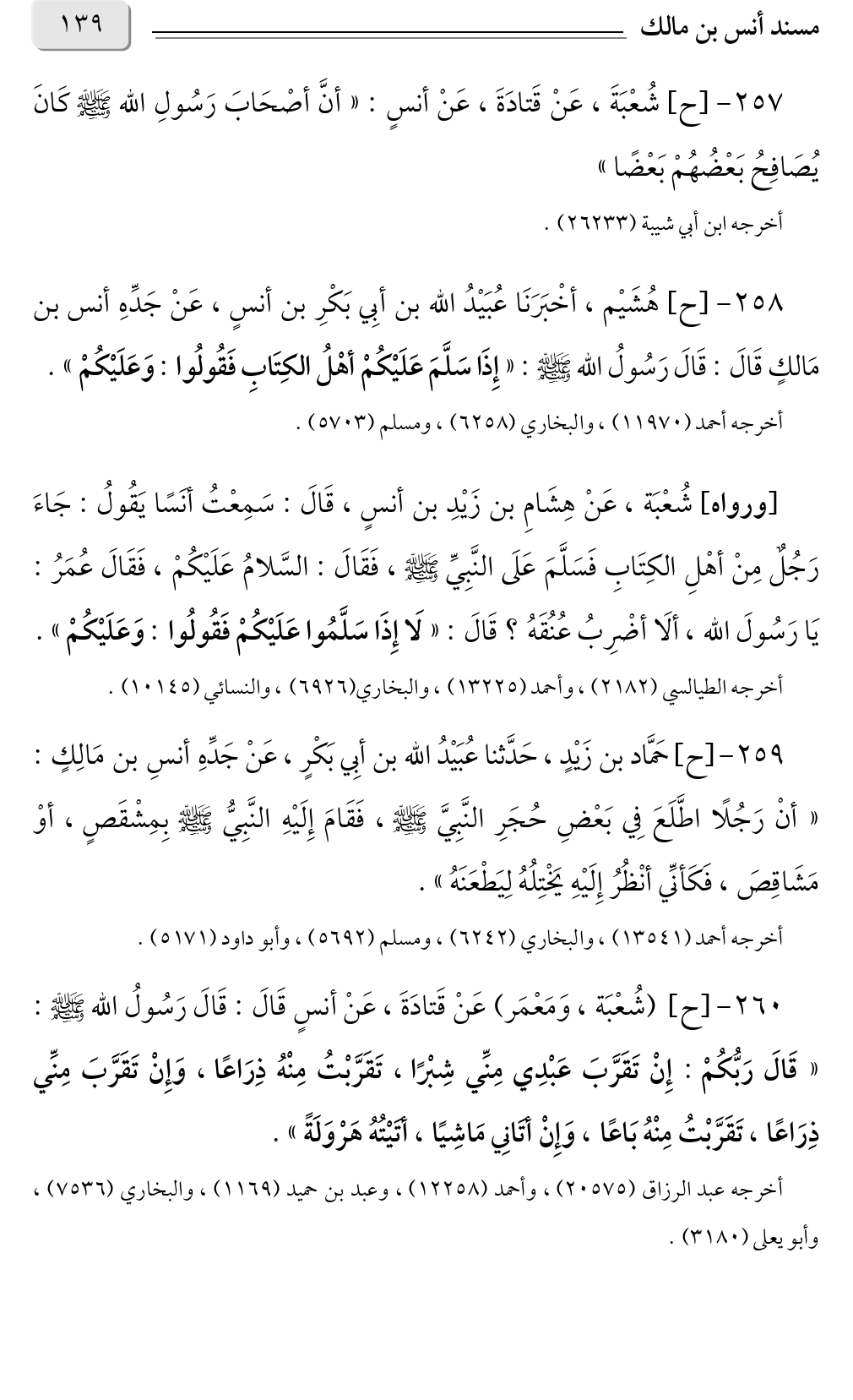٢٥٨ - [ح] هُشَيْم، أخْبَرَنَا عُبَيْدُ الله بن أبِي بَكْرِ بن أنسٍ، عَنْ جَدِّهِ أنس بن مَالكٍ قَالَ: قَالَ رَسُولُ الله صلى الله عليه وسلم: «إِذَا سَلَّمَ عَلَيْكُمْ أهْلُ الكِتَابِ فَقُولُوا: وَعَلَيْكُمْ».