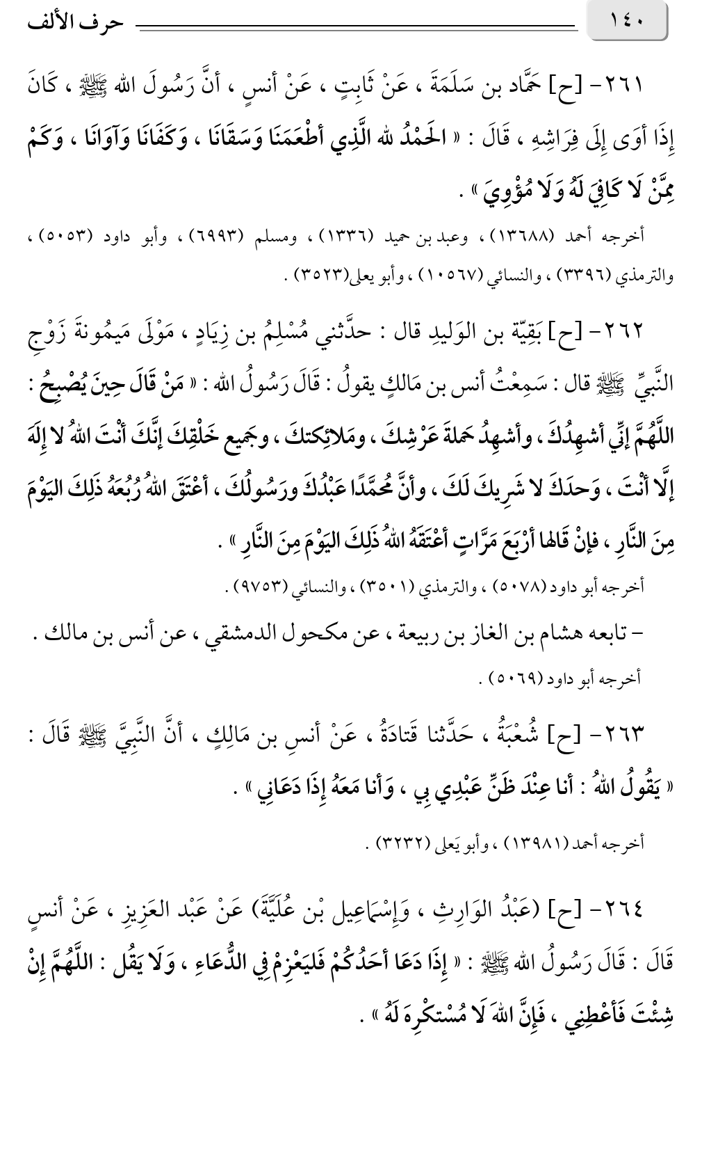 ٢٦١ - [ح] حَمَّاد بن سَلَمَةَ، عَنْ ثَابِتٍ، عَنْ أنسٍ، أنَّ رَسُولَ الله صلى الله عليه وسلم، كَانَ إِذَا أوَى إِلَى فِرَاشِهِ، قَالَ: «الحَمْدُ لله الَّذِي أطْعَمَنَا وَسَقَانَا، وَكَفَانَا وَآوَانَا، وَكَمْ مِمَّنْ لَا كَافِيَ لَهُ وَلَا مُؤْوِيَ».