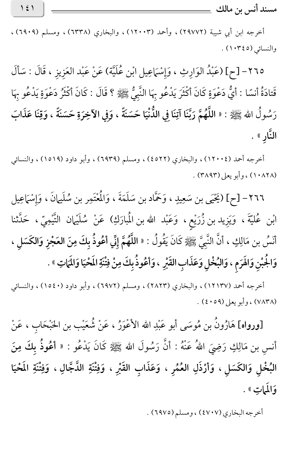 ٢٦٦ - [ح] (يَحْيَى بن سَعِيدٍ، وَحَمَّاد بن سَلَمَةَ، وَالمُعْتَمِر بن سُلَيمانَ، وَإِسْمَاعِيل ابْن عُليّةَ، وَيَزِيد بن زُرَيْعٍ، وَعَبْد الله بن المُبارَكِ) عَنْ سُلَيْمان التَّيْمِيّ، حَدَّثنا أنَسُ بن مَالِكٍ، أنَّ النَّبِيَّ صلى الله عليه وسلم كَانَ يَقُولُ: «اللَّهُمَّ إِنِّي أعُوذُ بِكَ مِنَ العَجْزِ وَالكَسَلِ، وَالجُبْنِ وَالَهرَمِ، وَالبُخْلِ وَعَذَابِ القَبْرِ، وَأعُوذُ بِكَ مِنْ فِتْنَةِ المَحْيَا وَالمَمَاتِ».