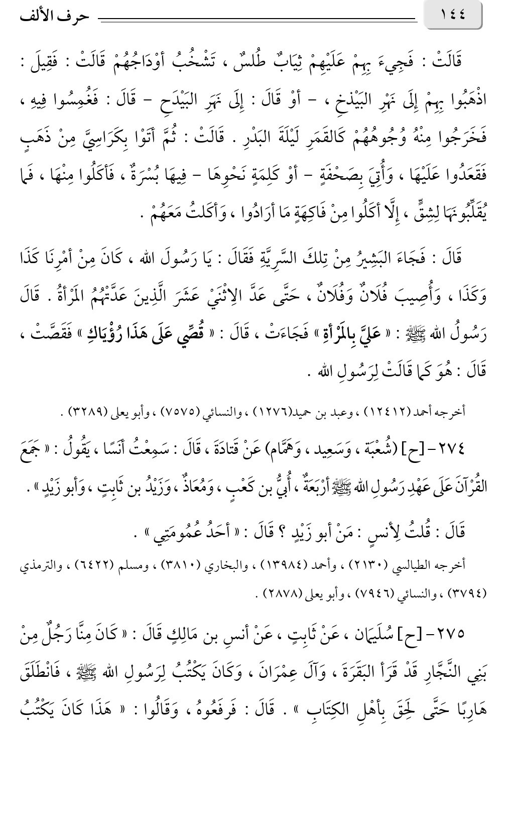 ٢٧٤ - [ح] (شُعْبَة، وَسَعِيد، وَهَمَّام) عَنْ قَتادَةَ، قَالَ: سَمِعْتُ أنَسًا، يَقُولُ: «جَمَعَ القُرْآنَ عَلَى عَهْدِ رَسُولِ الله صلى الله عليه وسلم أرْبَعَةٌ، أُبيُّ بن كَعْبٍ، وَمُعَاذٌ، وَزَيْدُ بن ثَابِتٍ، وَأبو زَيْدٍ».