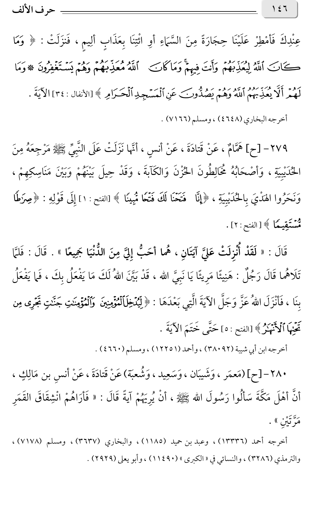٢٨٠ - [ح] (مَعمَر، وَشَيبَان، وَسَعِيد، وَشُعبَة) عَنْ قَتادَةَ، عَنْ أنسِ بن مَالِكٍ، أنَّ أهْلَ مَكَّةَ سَألُوا رَسُولَ الله صلى الله عليه وسلم، أنْ يُرِيَهُمْ آيةً قَالَ: «فَأرَاهُمْ انْشِقَاقَ القَمَرِ مَرَّتَيْنِ».