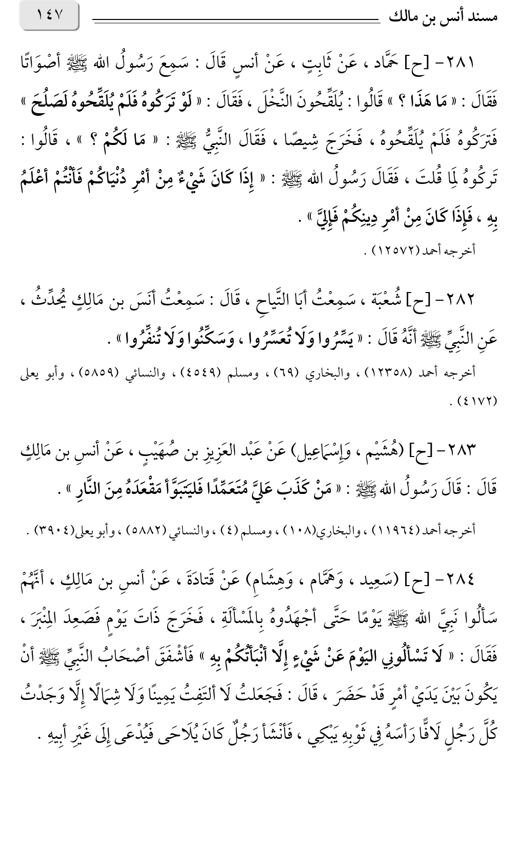 ٢٨١ - [ح] حَمَّاد، عَنْ ثَابِتٍ، عَنْ أنسٍ قَالَ: سَمِعَ رَسُولُ الله صلى الله عليه وسلم أصْوَاتًا فَقَالَ «مَا هَذَا؟ »: قَالُوا: يُلَقِّحُونَ النَّخْلَ فَقَالَ: «لَوْ تَرَكُوهُ فَلَمْ يُلَقِّحُوهُ لَصَلُحَ» فَترَكُوهُ فَلَمْ يُلَقِّحُوهُ، فَخَرَجَ شِيصًا، فَقَالَ النَّبِيُّ صلى الله عليه وسلم «مَا لَكُمْ؟ »، قَالُوا: تَركُوهُ لِمَا قُلتَ، فَقَالَ رَسُولُ الله صلى الله عليه وسلم: «إِذَا كَانَ شَيْءٌ مِنْ أمْرِ دُنْيَاكُمْ فَأنْتُمْ أعْلَمُ بِهِ، فَإِذَا كَانَ مِنْ أمْرِ دِينِكُمْ فَإِليَّ».
