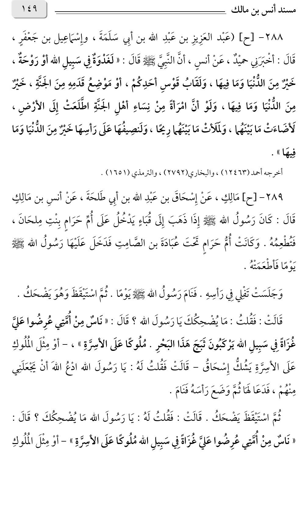 ٢٨٨ - [ح] (عَبْد العَزِيزِ بن عَبْدِ الله بن أبِي سَلَمَةَ، وإِسْمَاعِيل بن جَعْفَرٍ، قَالَ: أخْبَرَنِي حميْدٌ، عَنْ أنسٍ، أنَّ النَّبِيَّ صلى الله عليه وسلم قَالَ: «لَغَدْوَةٌ فِي سَبِيلِ الله أوْ رَوْحَةٌ، خَيْرٌ مِنَ الدُّنْيَا وَمَا فِيهَا، وَلَقَابُ قَوْسِ أحَدِكُمْ، أوْ مَوْضِعُ قَدَمِهِ مِنَ الجَنَّةِ، خَيْرٌ مِنَ الدُّنْيَا وَمَا فِيهَا، وَلَوْ أنَّ امْرَأةً مِنْ نِسَاءِ أهْلِ الجَنَّةِ اطَّلَعَتْ إِلَى الأرْضِ، لَأضَاءَتْ مَا بَيْنَهُما، وَلمَلَأتْ مَا بَيْنَهُما رِيحًا، وَلَنصِيفُهَا عَلَى رَأسِهَا خَيْرٌ مِنَ الدُّنْيَا وَمَا فِيهَا».