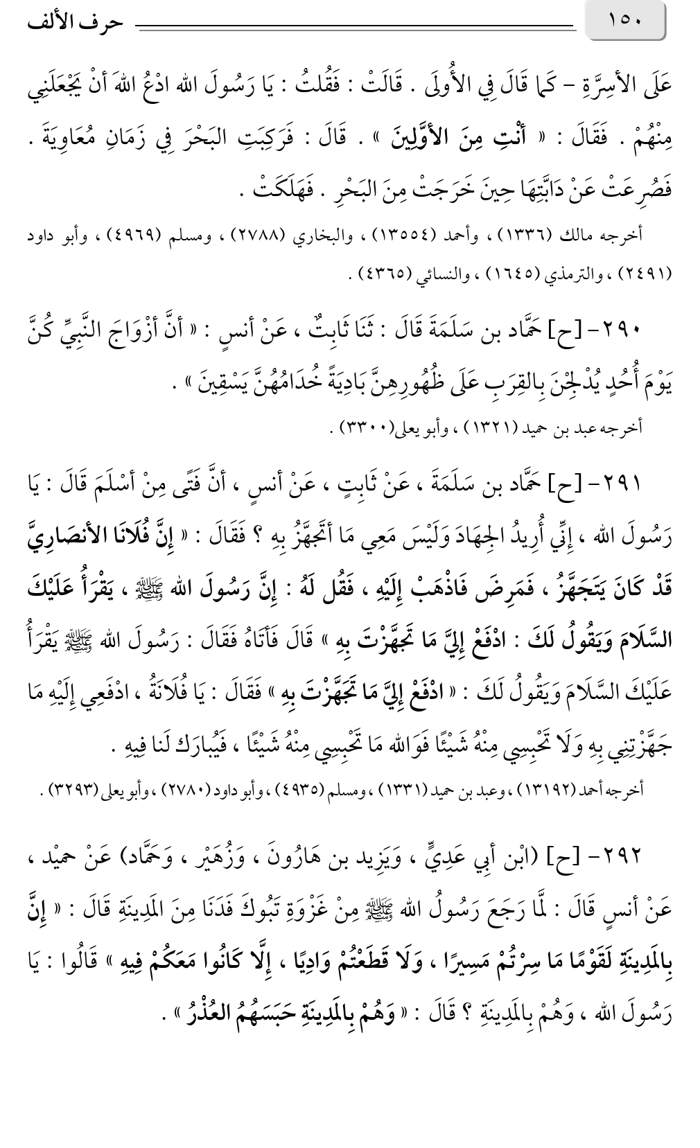 ٢٩٠ - [ح] حَمَّاد بن سَلَمَةَ قَالَ: ثَنَا ثَابِتٌ، عَنْ أنسٍ: «أنَّ أزْوَاجَ النَّبِيِّ كُنَّ يَوْمَ أُحُدٍ يُدْلجْنَ بِالقِرَبِ عَلَى ظُهُورِهِنَّ بَادِيَةً خُدَامُهُنَّ يَسْقِينَ».