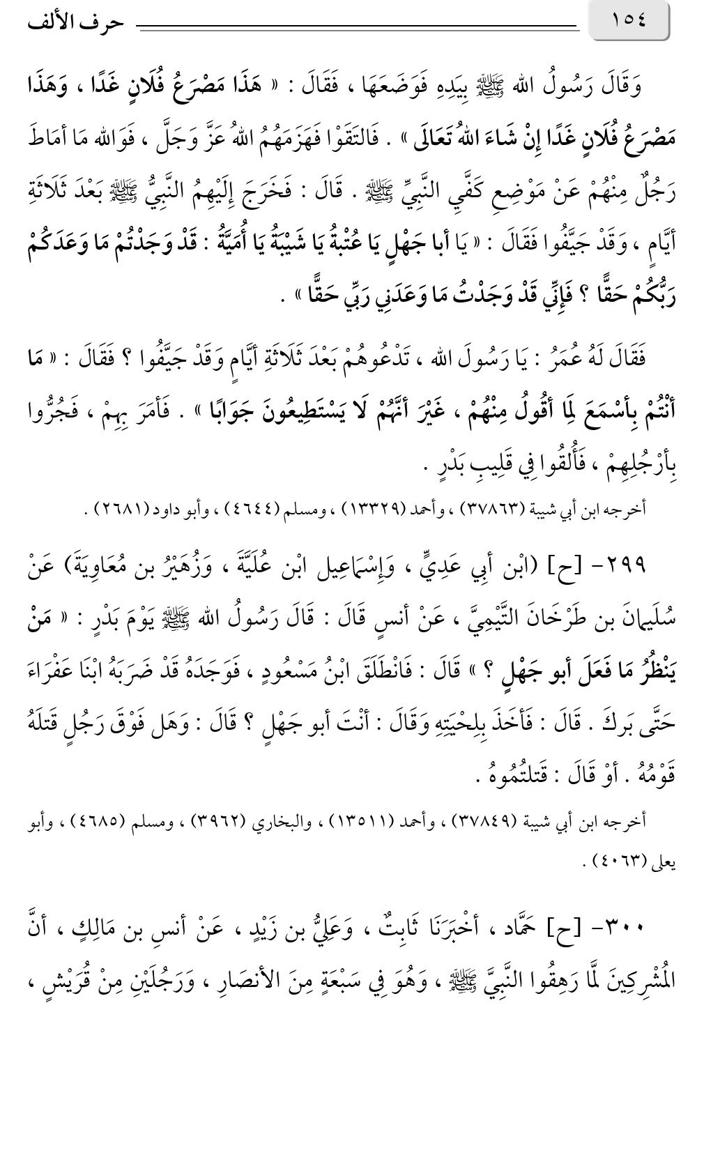 ٢٩٩ - [ح] (ابْن أبِي عَدِيٍّ، وَإِسْمَاعِيل ابْن عُلَيَّةَ، وَزُهَيْرُ بن مُعَاوِيَةَ) عَنْ سُلَيمانَ بن طَرْخَانَ التَّيْمِيَّ، عَنْ أنسٍ قَالَ: قَالَ رَسُولُ الله صلى الله عليه وسلم يَوْمَ بَدْرٍ: «مَنْ يَنْظُرُ مَا فَعَلَ أبو جَهْلٍ؟ » قَالَ: فَانْطَلَقَ ابْنُ مَسْعُودٍ، فَوَجَدَهُ قَدْ ضَرَبَهُ ابْنَا عَفْرَاءَ حَتَّى بَركَ. قَالَ: فَأخَذَ بِلِحْيَتِهِ وَقَالَ: أنْتَ أبو جَهْلٍ؟ قَالَ: وَهَل فَوْقَ رَجُلٍ قَتلَهُ قَوْمُهُ. أوْ قَالَ: قَتلتُمُوهُ.