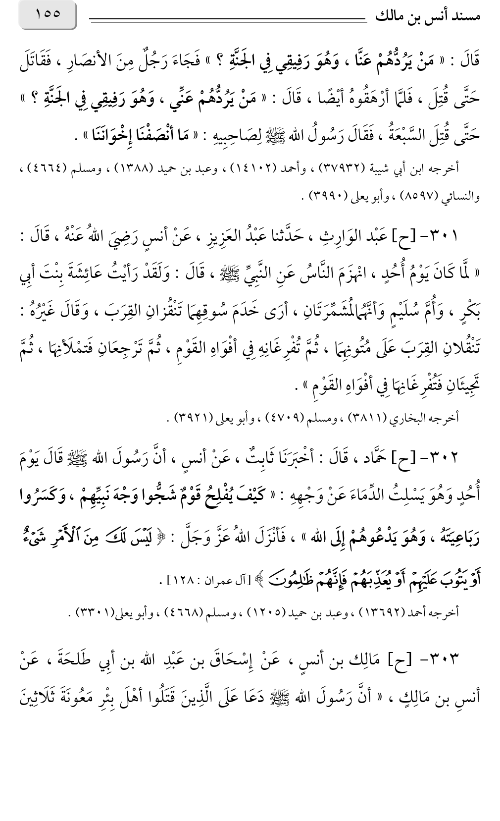 ٣٠٢ - [ح] حَمَّاد، قَالَ: أخْبَرَنَا ثَابِتٌ، عَنْ أنسٍ، أنَّ رَسُولَ الله صلى الله عليه وسلم قَالَ يَوْمَ أُحُدٍ وَهُوَ يَسْلِتُ الدِّمَاءَ عَنْ وَجْهِهِ: «كَيْفَ يُفْلِحُ قَوْمٌ شَجُّوا وَجْهَ نَبِيِّهِمْ، وَكَسَرُوا رَبَاعِيَتَهُ، وَهُوَ يَدْعُوهُمْ إِلَى الله»، فَأنْزَلَ اللهُ عَزَّ وَجَلَّ {لَيْسَ لَكَ مِنَ الْأَمْرِ شَيْءٌ أَوْ يَتُوبَ عَلَيْهِمْ أَوْ يُعَذِّبَهُمْ فَإِنَّهُمْ ظَالِمُونَ} [آل عمران: ١٢٨].