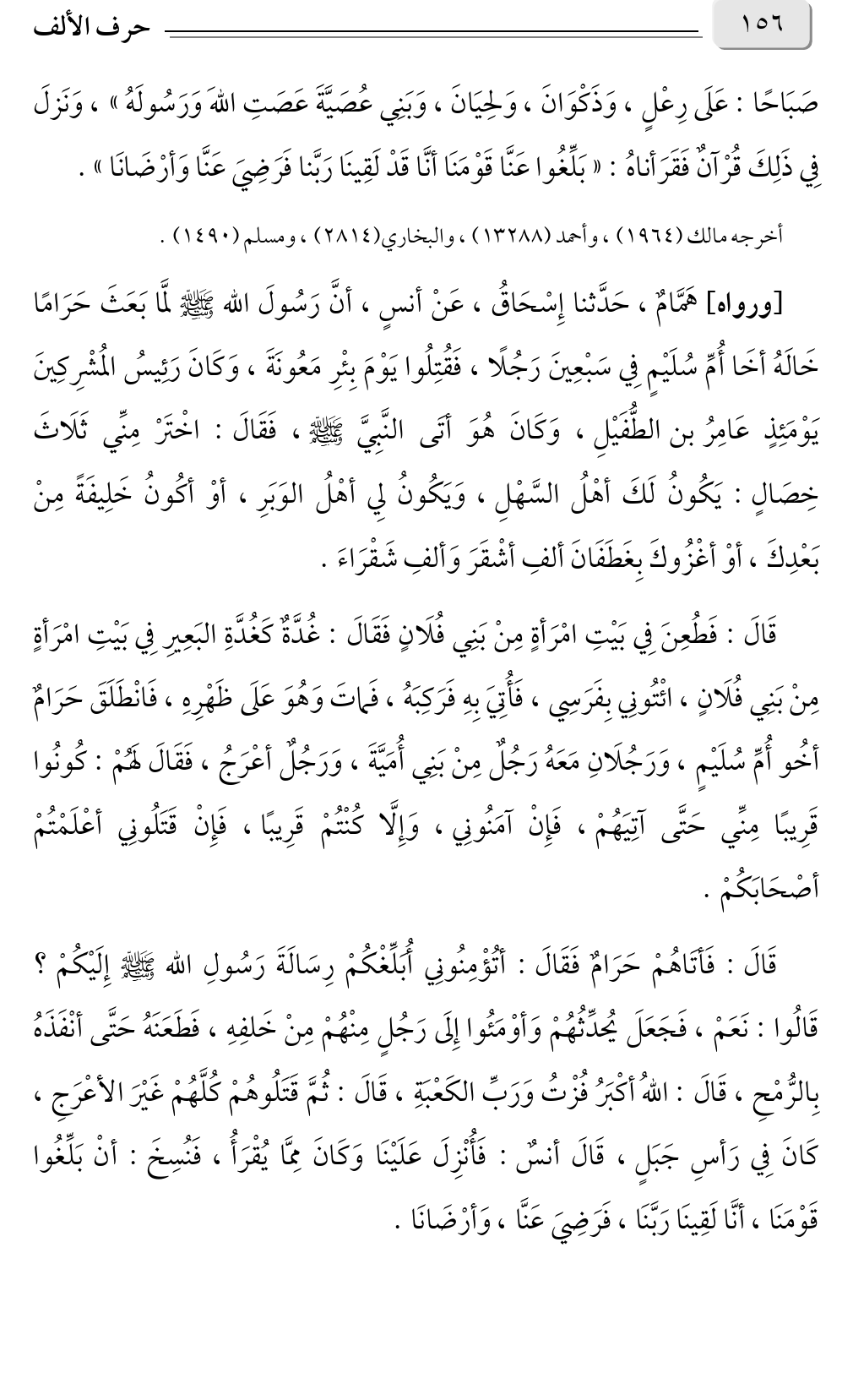 قَالَ: فَأتَاهُمْ حَرَامٌ فَقَالَ: أتُؤْمِنُونِي أُبَلِّغْكُمْ رِسَالَةَ رَسُولِ الله صلى الله عليه وسلم إِلَيْكُمْ؟ قَالُوا: نَعَمْ، فَجَعَلَ يُحدِّثُهُمْ وَأوْمَئُوا إِلَى رَجُلٍ مِنْهُمْ مِنْ خَلفِهِ، فَطَعَنَهُ حَتَّى أنْفَذَهُ بِالرُّمْحِ، قَالَ: اللهُ أكْبَرُ فُزْتُ وَرَبِّ الكَعْبَةِ، قَالَ: ثُمَّ قَتَلُوهُمْ كُلَّهُمْ غَيْرَ الأعْرَجِ، كَانَ فِي رَأسِ جَبَلٍ، قَالَ أنسٌ: فَأُنْزِلَ عَلَيْنَا وَكَانَ مِمَّا يُقْرَأُ، فَنُسِخَ: أنْ بَلِّغُوا قَوْمَنَا، أنَّا لَقِينَا رَبَّنَا، فَرَضِيَ عَنَّا، وَأرْضَانَا.