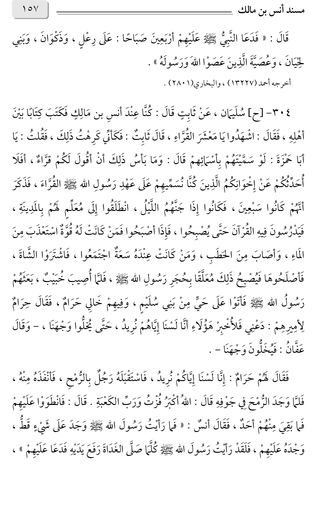 ٣٠٤ - [ح] سُلَيمَان، عَنْ ثَابِتٍ قَالَ: كُنَّا عِنْدَ أنسِ بن مَالِكٍ فَكَتَبَ كِتَابًا بَيْنَ أهْلِهِ، فَقَالَ: اشْهَدُوا يَا مَعْشَرَ القُرَّاءِ، قَالَ ثَابِتٌ: فَكَأنِّي كَرِهْتُ ذَلِكَ، فَقُلتُ: يَا أبَا حَمْزَةَ: لَوْ سَمَّيْتَهُمْ بِأسْمَائِهمْ قَالَ: وَمَا بَأسُ ذَلِكَ أنْ أقُولَ لَكُمْ قرَّاءٌ، أفَلَا أُحَدِّثُكُمْ عَنْ إِخْوَانِكُمُ الَّذِينَ كُنَّا نُسَمِّيهِمْ عَلَى عَهْدِ رَسُولِ الله صلى الله عليه وسلم القُرَّاءَ، فَذَكَرَ أنَّهُمْ كَانُوا سَبْعِينَ، فَكَانُوا إِذَا جَنَّهُمُ اللَّيْلُ، انْطَلَقُوا إِلَى مُعَلِّمٍ لَهُمْ بِالمَدِينَةِ، فَيَدْرُسُونَ فِيهِ القُرْآنَ حَتَّى يُصْبِحُوا، فَإِذَا أصْبَحُوا فَمَنْ كَانَتْ لَهُ قُوَّةٌ اسْتَعْذَبَ مِنَ المَاءِ، وَأصَابَ مِنَ الحَطَبِ، وَمَنْ كَانَتْ عِنْدَهُ سَعَةٌ اجْتَمَعُوا، فَاشْتَرَوْا الشَّاةَ، فَأصْلَحُوهَا فَيُصْبِحُ ذَلِكَ مُعَلَّقًا بِحُجَرِ رَسُولِ الله صلى الله عليه وسلم، فَلمَّا أُصِيبَ خُبَيْبٌ، بَعَثَهُمْ رَسُولُ الله صلى الله عليه وسلم فَأتَوْا عَلَى حَيٍّ مِنْ بَنِي سُلَيْمٍ، وَفِيهِمْ خَالِي حَرَامٌ، فَقَالَ حِرَامٌ لِأمِيرِهِمْ: دَعْنِي فَلأُخْبِرْ هَؤُلَاءِ أنَّا لَسْنَا إِيَّاهُمْ نُرِيدُ، حَتَّى يُخلُّوا وَجْهَنَا، - وَقَالَ عَفَّانُ: فَيُخَلُّونَ وَجْهَنَا -.