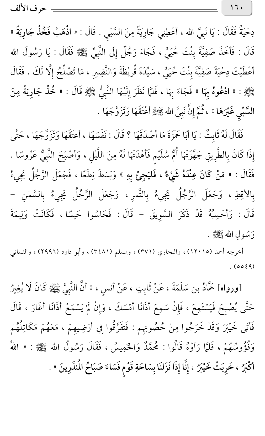 [ورواه] حَمَّادُ بن سَلَمَةَ، عَنْ ثَابِتٍ، عَنْ أنسٍ، «أنَّ النَّبِيَّ صلى الله عليه وسلم كَانَ لَا يُغِيرُ حَتَّى يُصْبِحَ فَيَسْتَمِعَ، فَإِنْ سَمِعَ أذَانًا أمْسَكَ، وَإِنْ لَمْ يَسْمَعْ أذَانًا أغَارَ، قَالَ فَأتَى خَيْبَرَ وَقَدْ خَرَجُوا مِنْ حُصُونِهِمْ: فَتفَرَّقُوا فِي أرْضِيهِمْ، مَعَهُمْ مَكَاتِلُهُمْ وَفُؤُوسُهُمْ، فَلمَّا رَأوْهُ قَالُوا: مُحمَّدٌ وَالخَمِيسُ، فَقَالَ رَسُولُ الله صلى الله عليه وسلم: «اللهُ أكْبَرُ، خَرِبَتْ خَيْبَرُ، إِنَّا إِذَا نَزَلنَا بِسَاحَةِ قَوْمٍ فَسَاءَ صَبَاحُ المُنذَرِينَ».