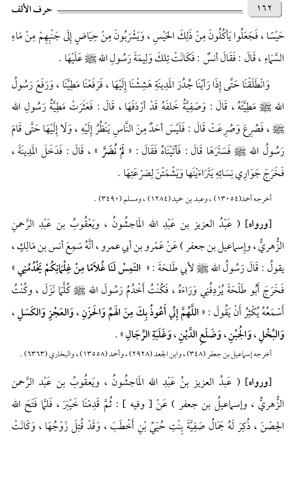 [ورواه] (عَبدُ العزيز بنُ عَبْدِ الله المَاجشُونُ، ويَعقُوبُ بن عَبْد الرَّحمن الزُّهريُّ، وإسماعيلُ بن جعفر) عَنْ [وفيه]: ثُمَّ قَدِمْنَا خَيْبَرَ، فَلمَّا فَتَحَ الله الحِصْنَ، ذُكِرَ لَهُ جَمَالُ صَفِيَّةَ بِنْتِ حُيَيِّ بْنِ أَخْطَبَ، وَقَدْ قُتِلَ زَوْجُهَا، وَكَانَتْ