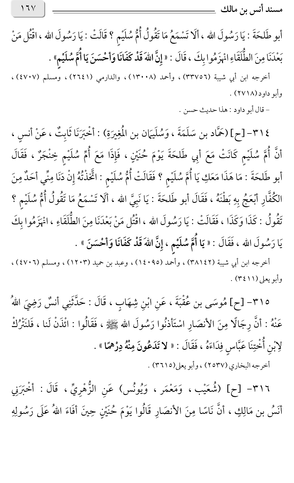 ٣١٤ - [ح] (حَمَّاد بن سَلَمَةَ، وَسُلَيمَان بن المُغِيرَةِ): أخْبَرَنَا ثَابِتٌ، عَنْ أنسٍ، أنَّ أُمَّ سُلَيْمٍ كَانَتْ مَعَ أبِي طَلحَةَ يَوْمَ حُنَيْنٍ، فَإِذَا مَعَ أُمِّ سُلَيْمٍ خِنْجَرٌ، فَقَالَ أبو طَلحَةَ: مَا هَذَا مَعَكِ يَا أُمَّ سُلَيْمٍ؟ فَقَالَتْ أُمُّ سُلَيْمٍ: اتَّخذْتُهُ إِنْ دَنَا مِنِّي أحَدٌ مِنَ الكُفَّارِ أبْعَجُ بِهِ بَطْنَهُ، فَقَالَ أبو طَلحَةَ: يَا نَبِيَّ الله، ألَا تَسْمَعُ مَا تَقُولُ أُمُّ سُلَيْمٍ؟ تَقُولُ: كَذَا وَكَذَا، فَقَالَتْ: يَا رَسُولَ الله، اقْتُل مَنْ بَعْدَنَا مِنَ الطُّلَقَاءِ، انْهَزَمُوا بِكَ يَا رَسُولَ الله، فَقَالَ: «يَا أُمَّ سُلَيْمٍ، إِنَّ اللهَ قَدْ كَفَانَا وَأحْسَنَ».