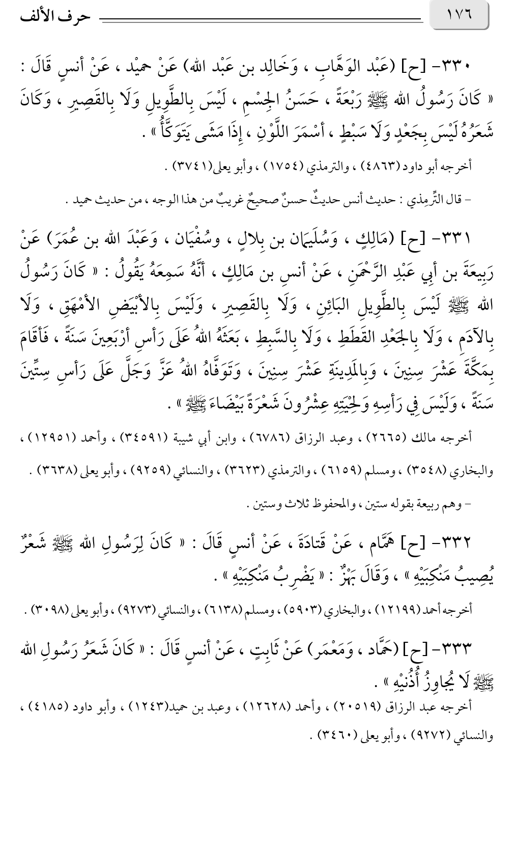 ٣٣٣ - [ح] (حَمَّاد، وَمَعْمَر) عَنْ ثَابِتٍ، عَنْ أنسٍ قَالَ: «كَانَ شَعَرُ رَسُولِ الله صلى الله عليه وسلم لَا يُجاوِزُ أُذُنيْهِ».