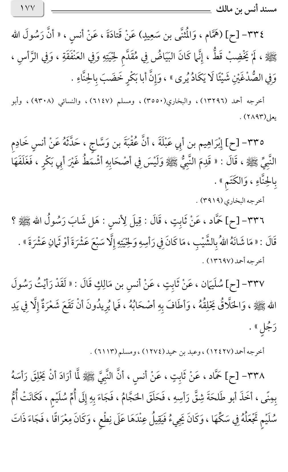 ٣٣٤ - [ح] (هَمَّام، وَالمُثنَّى بن سَعِيدٍ) عَنْ قَتادَةَ، عَنْ أنسٍ، «أنَّ رَسُولَ الله صلى الله عليه وسلم، لَمْ يَخْضِبْ قَطُّ، إِنَّما كَانَ البَيَاضُ فِي مُقَدَّمِ لِحْيَتِهِ وَفِي العَنْفَقَةِ، وَفِي الرَّأسِ، وَفِي الصُّدْغَيْنِ شَيْئًا لَا يَكَادُ يُرى»، وَإِنَّ أبا بَكْرٍ خَضَبَ بِالحِنَّاءِ.