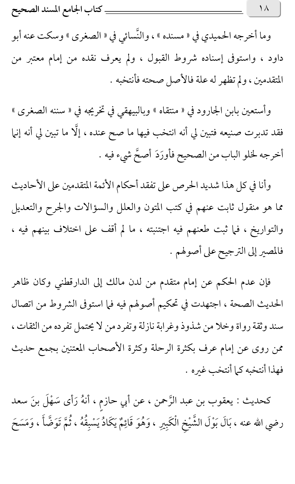 وأنا في كل هذا شديد الحرص على تفقد أحكام الأئمة المتقدمين على الأحاديث مما هو منقول ثابت عنهم في كتب المتون والعلل والسؤالات والجرح والتعديل والتواريخ، فما ثبت طعنهم فيه اجتنبته، ما لم أقف على اختلاف بينهم فيه، فالمصير إلى الترجيح على أصولهم.