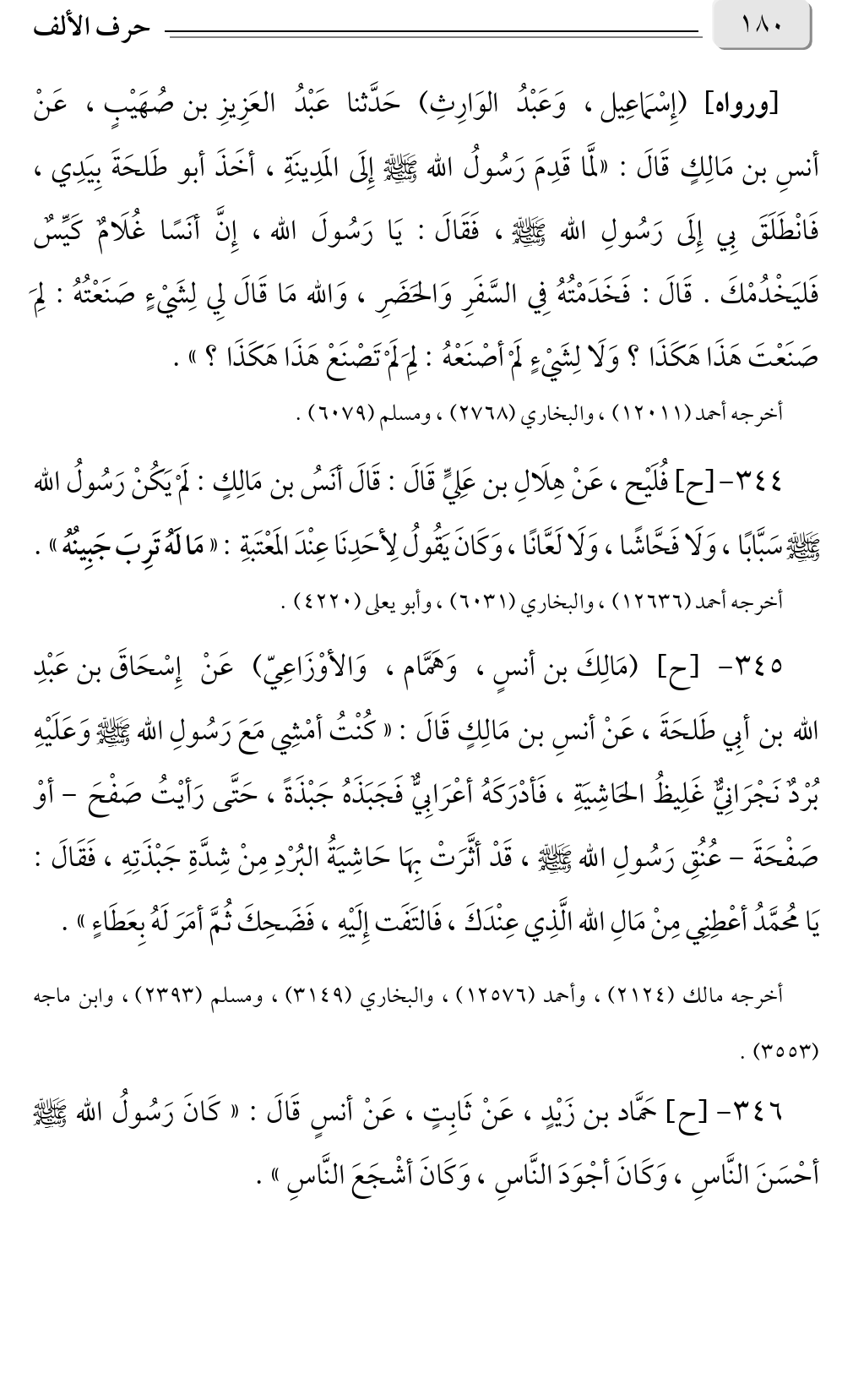 ٣٤٥ - [ح] (مَالِكَ بن أنسٍ، وَهَمَّام، وَالأوْزَاعِيّ) عَنْ إِسْحَاقَ بن عَبْدِ الله بن أبِي طَلحَةَ، عَنْ أنسِ بن مَالِكٍ قَالَ: «كُنْتُ أمْشِي مَعَ رَسُولِ الله صلى الله عليه وسلم وَعَلَيْهِ بُرْدٌ نَجْرَانِيٌّ غَلِيظُ الحَاشِيَةِ، فَأدْرَكَهُ أعْرَابِيٌّ فَجَبَذَهُ جَبْذَةً، حَتَّى رَأيْتُ صَفْحَ - أوْ صَفْحَةَ - عُنُقِ رَسُولِ الله صلى الله عليه وسلم، قَدْ أثَّرَتْ بِهَا حَاشِيَةُ البُرْدِ مِنْ شِدَّةِ جَبْذَتِهِ، فَقَالَ: «يَا مُحمَّدُ أعْطِنِي مِنْ مَالِ الله الَّذِي عِنْدَكَ، فَالتَفَت إِلَيْهِ، فَضَحِكَ ثُمَّ أمَرَ لَهُ بِعَطَاءٍ».