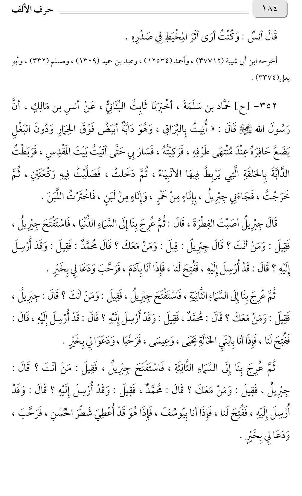 ٣٥٢ - [ح] حَمَّاد بن سَلَمَةَ، أخْبَرَنَا ثَابِتٌ البُنَانِيُّ، عَنْ أنسِ بن مَالِكٍ، أنَّ رَسُولَ الله صلى الله عليه وسلم قَالَ: «أُتِيتُ بِالبُرَاقِ، وَهُوَ دَابَّةٌ أبْيَضُ فَوْقَ الحِمَارِ وَدُونَ البَغْلِ يَضَعُ حَافِرَهُ عِنْدَ مُنْتهَى طَرْفِهِ، فَرَكِبْتُهُ، فَسَارَ بِي حَتَّى أتَيْتُ بَيْتَ المَقْدِسِ، فَرَبَطْتُ الدَّابَّةَ بِالحَلقَةِ الَّتِي يَرْبِطُ فِيهَا الأنْبِيَاءُ، ثُمَّ دَخَلتُ، فَصَلَّيْتُ فِيهِ رَكْعَتَيْنِ، ثُمَّ خَرَجْتُ، فَجَاءَنِي جِبْرِيلُ، بِإِنَاءٍ مِنْ خَمْرٍ، وَإِنَاءٍ مِنْ لَبَنٍ، فَاخْتَرْتُ اللَّبَنَ.