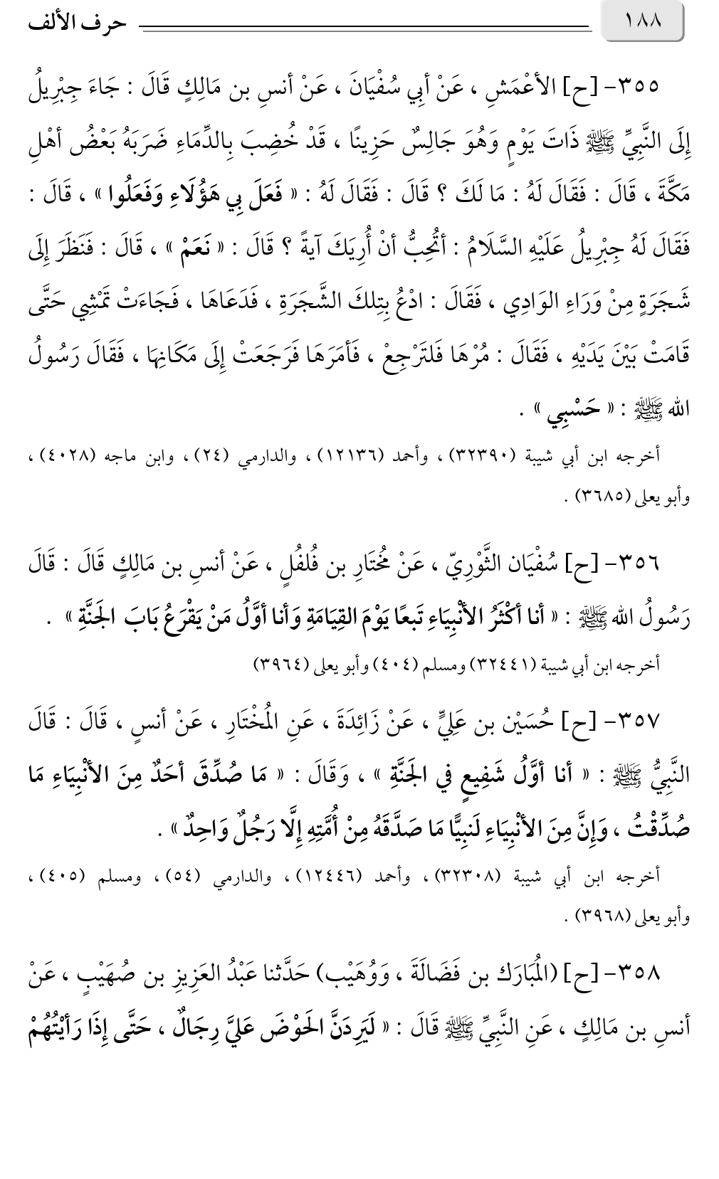 ٣٥٥ - [ح] الأعْمَشِ، عَنْ أبِي سُفْيَانَ، عَنْ أنسِ بن مَالِكٍ قَالَ: جَاءَ جِبْرِيلُ إِلَى النَّبِيِّ صلى الله عليه وسلم ذَاتَ يَوْمٍ وَهُوَ جَالِسٌ حَزِينًا، قَدْ خُضِبَ بِالدِّمَاءِ ضَرَبَهُ بَعْضُ أهْلِ مَكَّةَ، قَالَ: فَقَالَ لَهُ: مَا لَكَ؟ قَالَ: فَقَالَ لَهُ «فَعَلَ بِي هَؤُلَاءِ وَفَعَلُوا»، قَالَ: فَقَالَ لَهُ جِبْرِيلُ عَلَيْهِ السَّلَامُ: أتُحِبُّ أنْ أُرِيَكَ آيةً؟ قَالَ: «نَعَمْ»: قَالَ: فَنَظَرَ إِلَى، شَجَرَةٍ مِنْ وَرَاءِ الوَادِي، فَقَالَ: ادْعُ بِتِلكَ الشَّجَرَةِ، فَدَعَاهَا، فَجَاءَتْ تَمْشِي حَتَّى قَامَتْ بَيْنَ يَدَيْهِ، فَقَالَ: مُرْهَا فَلتَرْجِعْ، فَأمَرَهَا فَرَجَعَتْ إِلَى مَكَانِهَا، فَقَالَ رَسُولُ الله صلى الله عليه وسلم: «حَسْبِي».