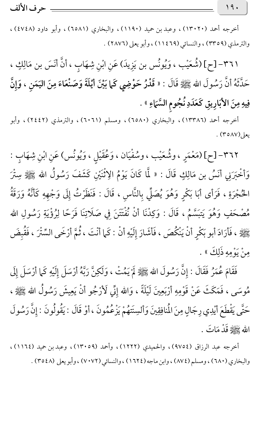 ٣٦١ - [ح] (شُعَيْب، وَيُونُس بن يَزِيدَ) عَنِ ابْنِ شِهَابٍ، أنَّ أنَسَ بن مَالِكٍ، حَدَّثَهُ أنَّ رَسُولَ الله صلى الله عليه وسلم قَالَ: «قَدْرُ حَوْضِي كَما بَيْنَ أيْلَةَ وَصَنْعَاءَ مِنَ اليَمَنِ، وَإِنَّ فِيهِ مِنَ الأبَارِيقِ كَعَدَدِ نُجُومِ السَّمَاءِ».