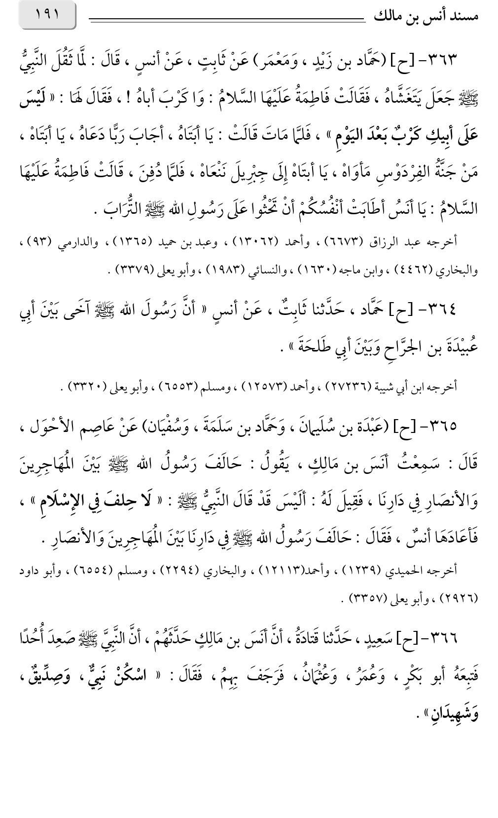 ٣٦٤ - [ح] حَمَّاد، حَدَّثنا ثَابِتٌ، عَنْ أنسٍ «أنَّ رَسُولَ الله صلى الله عليه وسلم آخَى بَيْنَ أبِي عُبيْدَةَ بن الجرَّاحِ وَبَيْنَ أبِي طَلحَةَ».