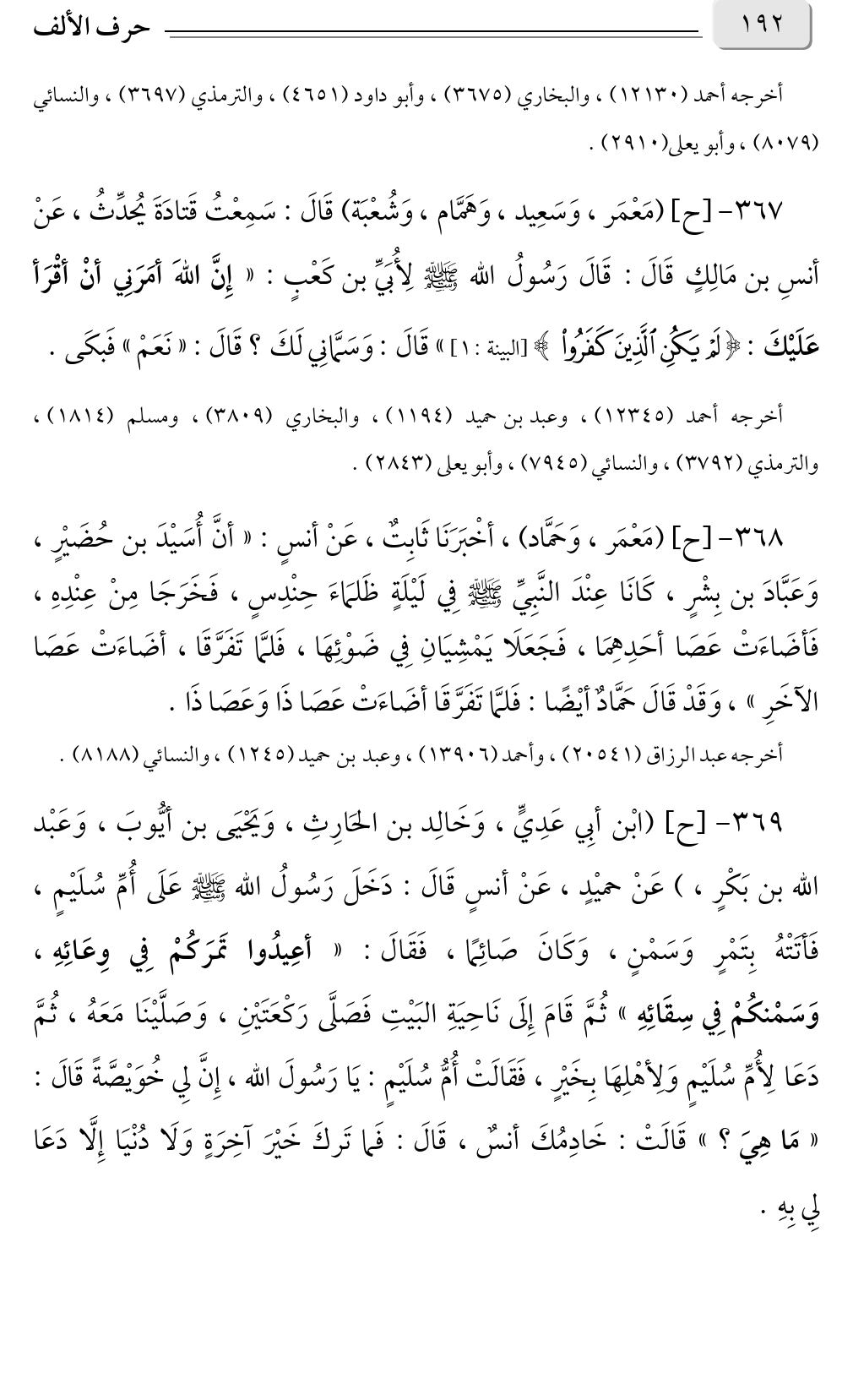 ٣٦٧ - [ح] (مَعْمَر، وَسَعِيد، وَهَمَّام، وَشُعْبَة) قَالَ: سَمِعْتُ قَتادَةَ يُحدِّثُ، عَنْ أنسِ بن مَالِكٍ قَالَ: قَالَ رَسُولُ الله صلى الله عليه وسلم لِأُبَيِّ بن كَعْبٍ: «إِنَّ اللهَ أمَرَنِي أنْ أقْرَأ عَلَيْكَ {لَمْ يَكُنِ الَّذِينَ كَفَرُوا} [البينة: ١] قَالَ: وَسَمَّانِي لَكَ؟ قَالَ «نَعَمْ» فَبكَى.