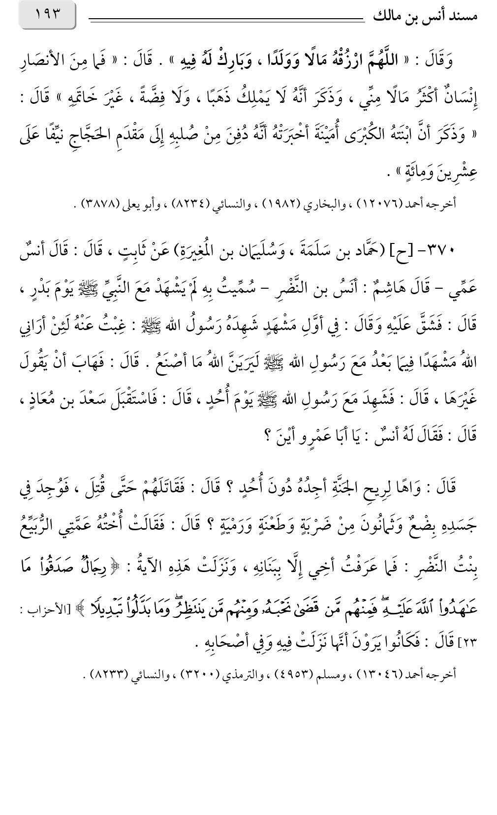 ٣٧٠ - [ح] (حَمَّاد بن سَلَمَةَ، وَسُلَيمَان بن المُغِيرَةِ) عَنْ ثَابِتٍ، قَالَ: قَالَ أنسٌ عَمِّي - قَالَ هَاشِمٌ: أنَسُ بن النَّضْرِ - سُمِّيتُ بِهِ لَمْ يَشْهَدْ مَعَ النَّبِيِّ صلى الله عليه وسلم يَوْمَ بَدْرٍ، قَالَ: فَشَقَّ عَلَيْهِ وَقَالَ: فِي أوَّلِ مَشْهَدٍ شَهِدَهُ رَسُولُ الله صلى الله عليه وسلم: غِبْتُ عَنْهُ لَئِنْ أرَانِي اللهُ مَشْهَدًا فِيمَا بَعْدُ مَعَ رَسُولِ الله صلى الله عليه وسلم لَيَرَيَنَّ اللهُ مَا أصْنَعُ. قَالَ: فَهَابَ أنْ يَقُولَ غَيْرَهَا، قَالَ: فَشَهِدَ مَعَ رَسُولِ الله صلى الله عليه وسلم يَوْمَ أُحُدٍ، قَالَ: فَاسْتَقْبَلَ سَعْدَ بن مُعَاذٍ، قَالَ: فَقَالَ لَهُ أنسٌ: يَا أبَا عَمْرٍو أيْنَ؟