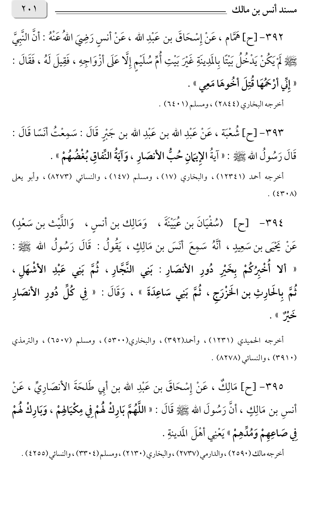 ٣٩٤ - [ح] (سُفْيَانَ بن عُيَيْنَةَ، وَمَالِك بن أنسٍ، وَاللَّيْث بن سَعْدٍ) عَنْ يَحْيَى بن سَعِيدٍ، أنَّهُ سَمِعَ أنَسَ بن مَالِكٍ، يَقُولُ: قَالَ رَسُولُ الله صلى الله عليه وسلم: «ألا أُخْبِرُكُمْ بِخَيْرِ دُورِ الأنصَارِ: بَنِي النَّجَّارِ، ثُمَّ بَنِي عَبْدِ الأشْهَلِ، ثُمَّ بِالحَارِثِ بن الخَزْرَجِ، ثُمَّ بَنِي سَاعِدَةَ»، وَقَالَ: «فِي كُلِّ دُورِ الأنصَارِ خَيْرٌ».