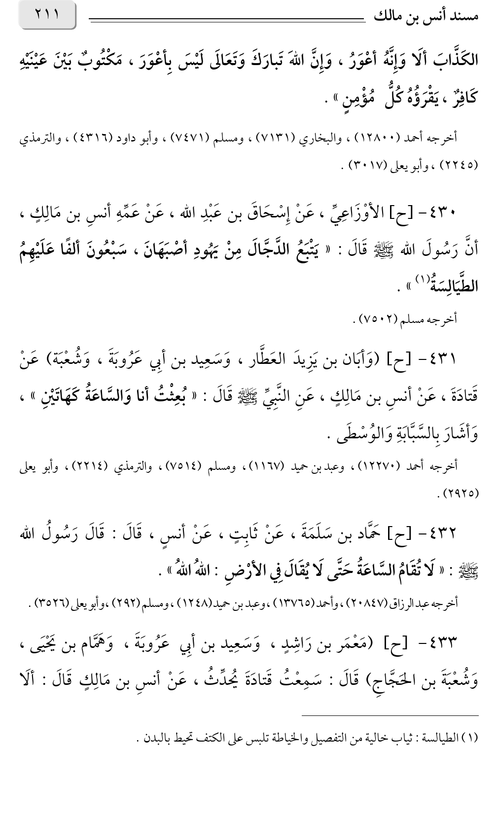 ٤٣٠ - [ح] الأوْزَاعِيِّ، عَنْ إِسْحَاقَ بن عَبْدِ الله، عَنْ عَمِّهِ أنسِ بن مَالِكٍ، أنَّ رَسُولَ الله صلى الله عليه وسلم قَالَ: «يَتْبَعُ الدَّجَّالَ مِنْ يَهُودِ أصْبَهَانَ، سَبْعُونَ ألفًا عَلَيْهِمُ الطَّيَالِسَةُ (¬١)».