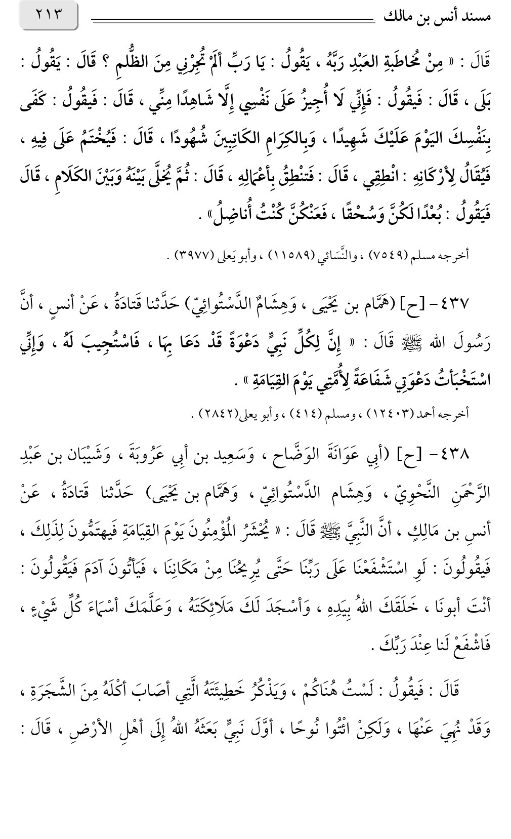 ٤٣٨ - [ح] (أبِي عَوَانَةَ الوَضَّاح، وَسَعِيد بن أبِي عَرُوبَةَ، وَشَيْبَان بن عَبْدِ الرَّحْمَنِ النَّحْوِيّ، وَهِشَام الدَّسْتُوائِيّ، وَهَمَّام بن يَحْيَى) حَدَّثنا قَتادَةُ، عَنْ أنسِ بن مَالِكٍ، أنَّ النَّبِيَّ صلى الله عليه وسلم قَالَ: «يُحْشَرُ المُؤْمِنُونَ يَوْمَ القِيَامَةِ فَيهتَمُّونَ لِذَلِكَ، فَيقُولُونَ: لَوِ اسْتَشْفَعْنَا عَلَى رَبِّنَا حَتَّى يُرِيحُنَا مِنْ مَكَانِنَا، فَيَأتُونَ آدَمَ فَيَقُولُونَ: أنْتَ أبونَا، خَلَقَكَ اللهُ بِيَدِهِ، وَأسْجَدَ لَكَ مَلَائِكَتَهُ، وَعَلَّمَكَ أسْمَاءَ كُلِّ شَيْءٍ، فَاشْفَعْ لَنا عِنْدَ رَبِّكَ.
