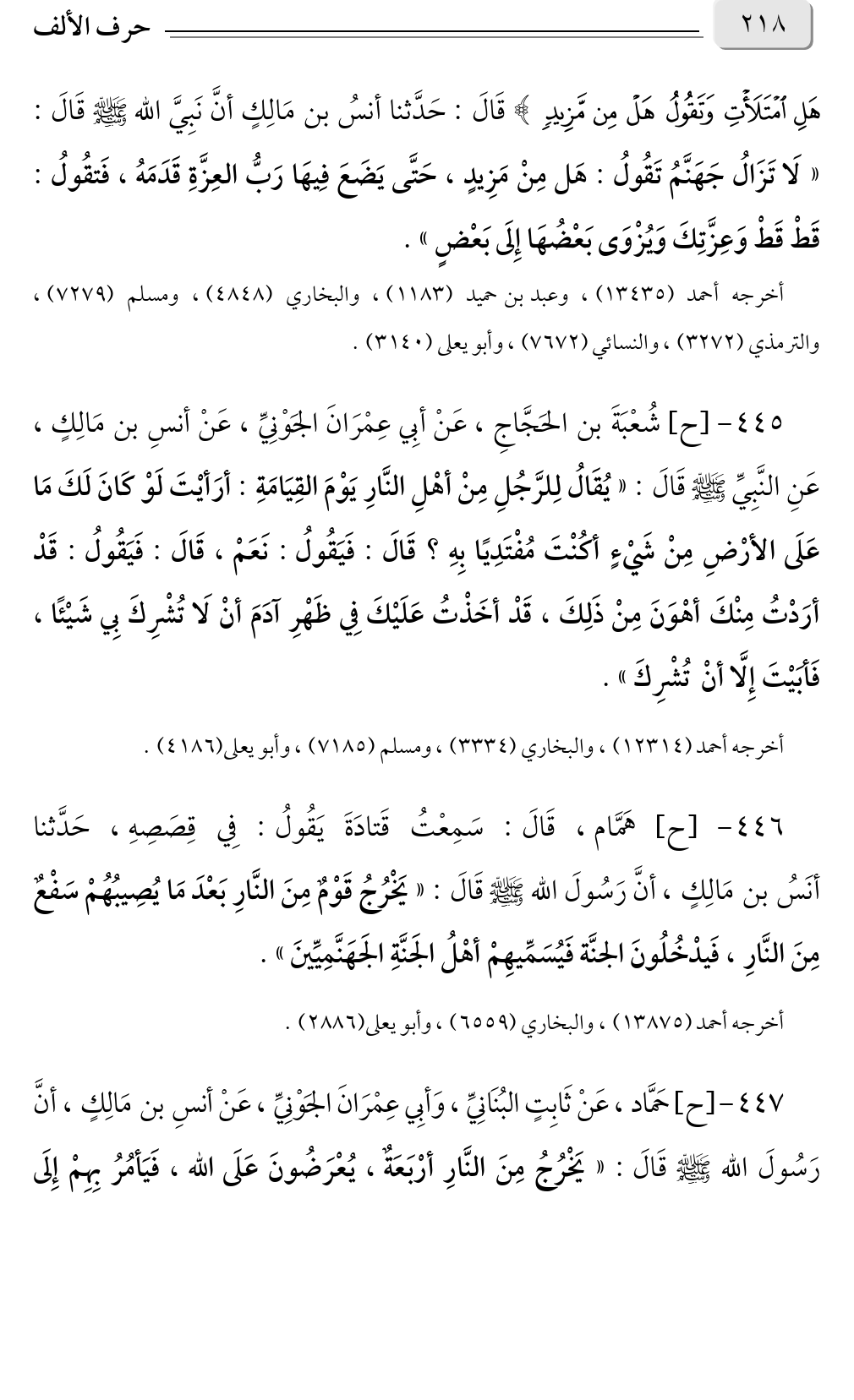 ٤٤٧ - [ح] حَمَّاد، عَنْ ثَابِتٍ البُنَانِيِّ، وَأبِي عِمْرَانَ الجَوْنِيِّ، عَنْ أنسِ بن مَالِكٍ، أنَّ رَسُولَ الله صلى الله عليه وسلم قَالَ: «يَخْرُجُ مِنَ النَّارِ أرْبَعَةٌ، يُعْرَضُونَ عَلَى الله، فَيَأمُرُ بِهِمْ إِلَى