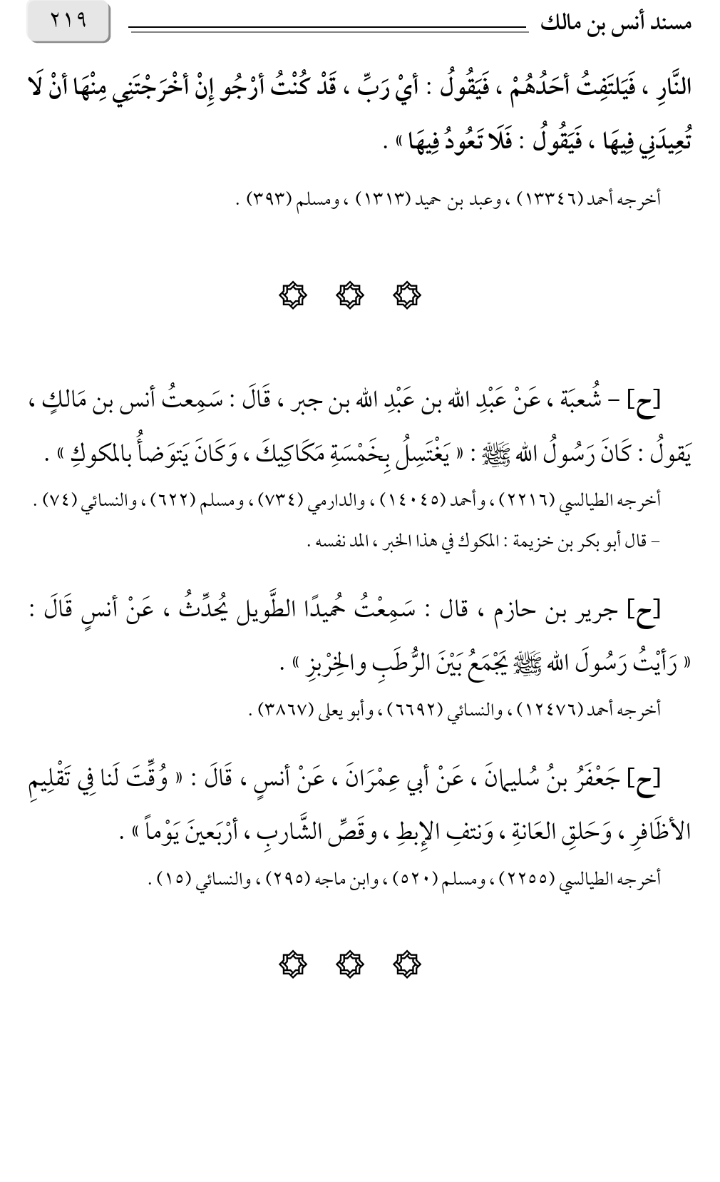 [ح]- شُعبَة، عَنْ عَبْدِ الله بن عَبْدِ الله بن جبر، قَالَ: سَمِعتُ أنس بن مَالكٍ، يَقولُ: كَانَ رَسُولُ الله صلى الله عليه وسلم: «يَغْتَسِلُ بِخَمْسَةِ مَكَاكِيكَ، وَكَانَ يَتوَضأُ بالمكوكِ».