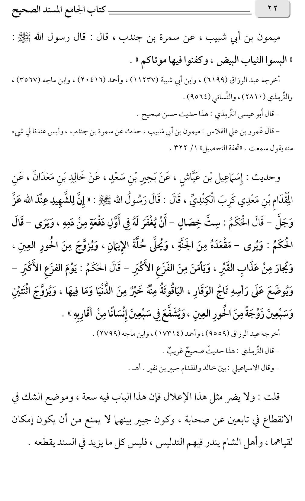 قلت: ولا يضر مثل هذا الإعلال فإن هذا الباب فيه سعة، وموضع الشك في الانقطاع في تابعين عن صحابة، وكون جبير بينهما لا يمنع من أن يكون إمكان لقياهما، وأهل الشام يندر فيهم التدليس، فليس كل ما يزيد في السند يقطعه.