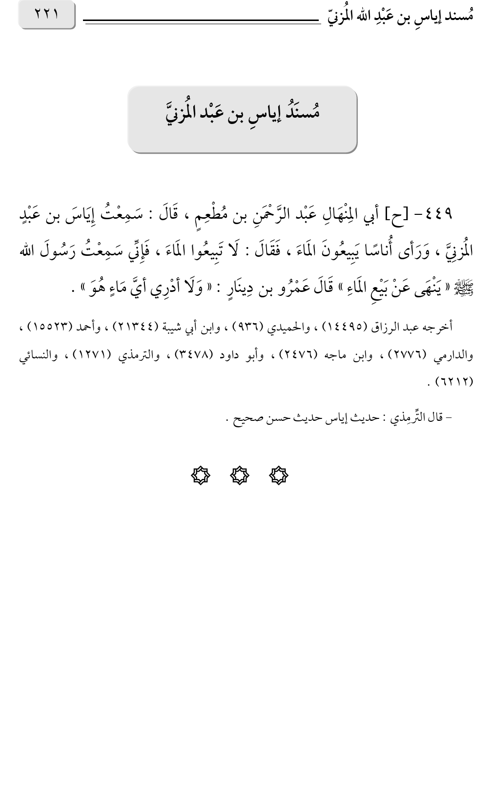 ٤٤٩ - [ح] أبي المِنْهَالِ عَبْد الرَّحْمَنِ بن مُطْعِمٍ، قَالَ: سَمِعْتُ إِيَاسَ بن عَبْدٍ المُزنِيَّ، وَرَأى أُناسًا يَبِيعُونَ المَاءَ، فَقَالَ: لَا تَبِيعُوا المَاءَ، فَإِنِّي سَمِعْتُ رَسُولَ الله صلى الله عليه وسلم «يَنْهَى عَنْ بَيْعِ المَاءِ» قَالَ عَمْرُو بن دِينَارٍ: «وَلَا أدْرِي أيَّ مَاءٍ هُوَ».