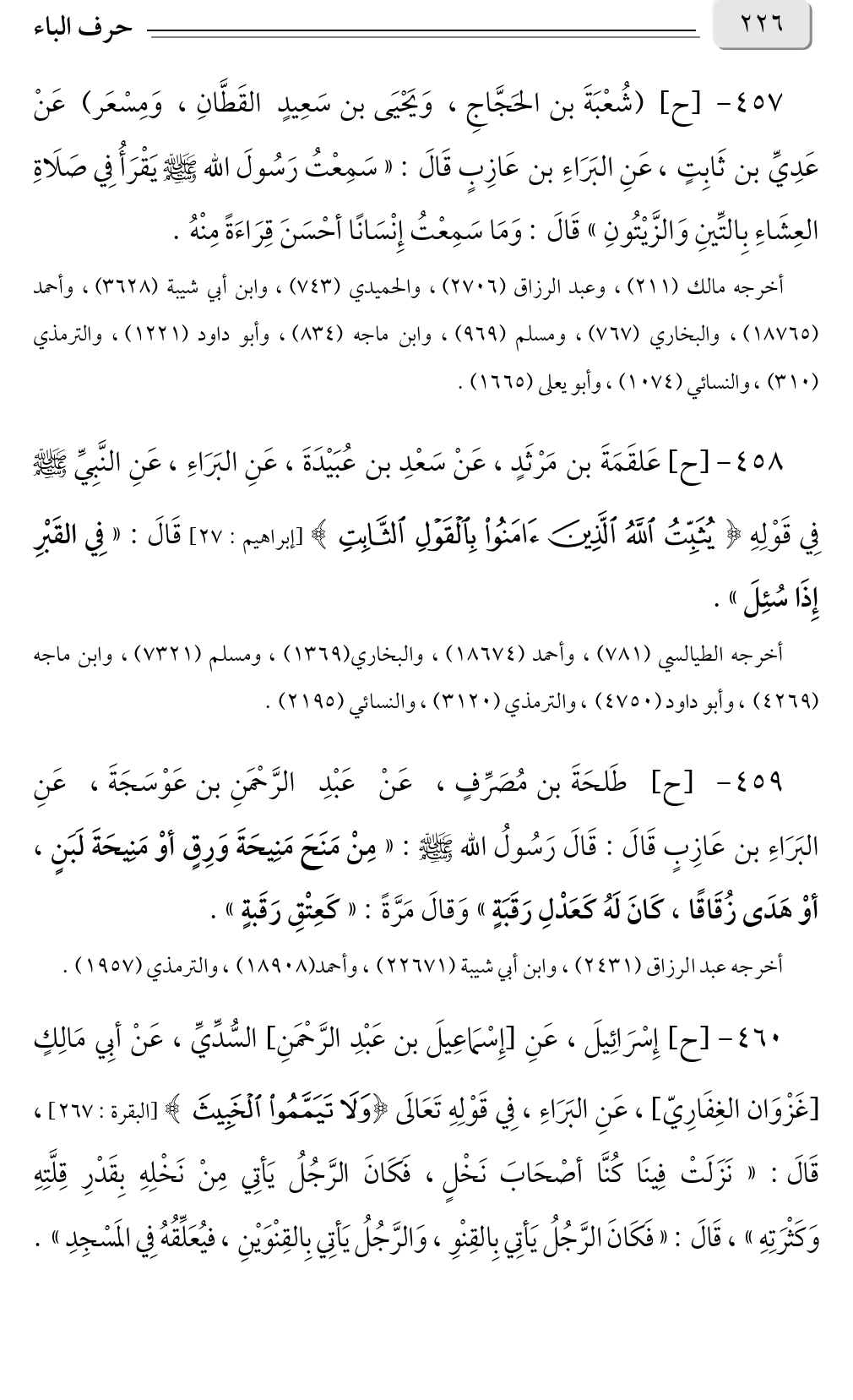 ٤٥٧ - [ح] (شُعْبَةَ بن الحَجَّاجِ، وَيَحْيَى بن سَعِيدٍ القَطَّانِ، وَمِسْعَر) عَنْ عَدِيِّ بن ثَابِتٍ، عَنِ البَرَاءِ بن عَازِبٍ قَالَ: «سَمِعْتُ رَسُولَ الله صلى الله عليه وسلم يَقْرَأُ فِي صَلَاةِ العِشَاءِ بِالتِّينِ وَالزَّيْتُونِ» قَالَ: وَمَا سَمِعْتُ إِنْسَانًا أحْسَنَ قِرَاءَةً مِنْهُ.