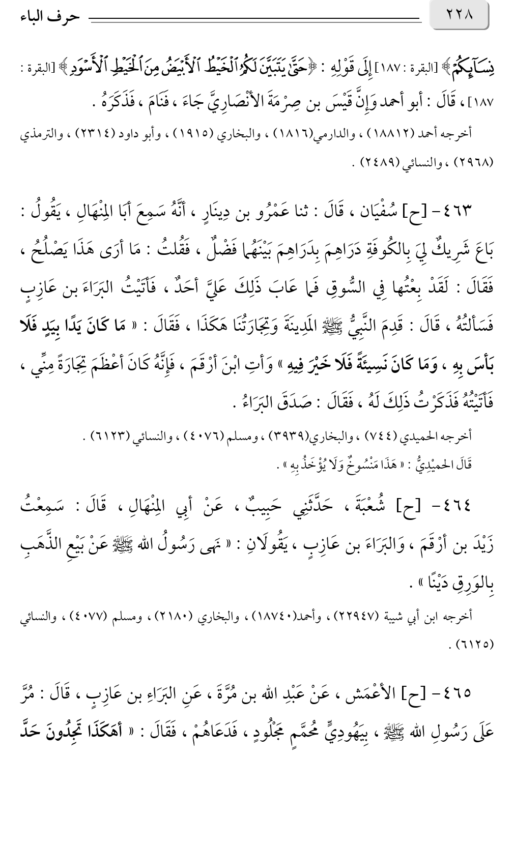 ٤٦٤ - [ح] شُعْبَةَ، حَدَّثَنِي حَبِيبٌ، عَنْ أبِي المِنْهَالِ، قَالَ: سَمِعْتُ زَيْدَ بن أرْقَمَ، وَالبَرَاءَ بن عَازِبٍ، يَقُولَانِ: «نَهى رَسُولُ الله صلى الله عليه وسلم عَنْ بَيْعِ الذَّهَبِ بِالوَرِقِ دَيْنًا».