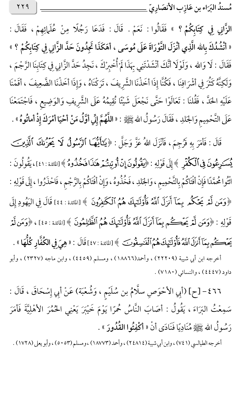 قَالَ: فَأمَرَ بِهِ فَرُجِمَ، فَأنْزَلَ اللهُ عَزَّ وَجَلَّ: {يَاأَيُّهَا الرَّسُولُ لَا يَحْزُنْكَ الَّذِينَ يُسَارِعُونَ فِي الْكُفْرِ} [المائدة: ٤١] إِلَى قَوْلِهِ: {يَقُولُونَ إِنْ أُوتِيتُمْ هَذَا فَخُذُوهُ} [المائدة: ٤١] يَقُولُونَ: ائْتُوا مُحمَّدًا فَإِنْ أفْتَاكُمْ بِالتَّحْمِيمِ، وَالجَلدِ، فَخُذُوهُ، وَإِنْ أفْتَاكُمْ بِالرَّجْمِ، فَاحْذَرُوا، إِلَى قَوْلِهِ: {وَمَنْ لَمْ يَحْكُمْ بِمَا أَنْزَلَ اللَّهُ فَأُولَئِكَ هُمُ الْكَافِرُونَ} [المائدة: ٤٤] قَالَ فِي اليَهُودِ إِلَى قَوْلِهِ: {وَمَنْ لَمْ يَحْكُمْ بِمَا أَنْزَلَ اللَّهُ فَأُولَئِكَ هُمُ الظَّالِمُونَ} [المائدة: ٤٥]، {وَمَنْ لَمْ يَحْكُمْ بِمَا أَنْزَلَ اللَّهُ فَأُولَئِكَ هُمُ الْفَاسِقُونَ} [المائدة: ٤٧] قَالَ: «هِيَ فِي الكُفَّارِ كُلُّهَا».