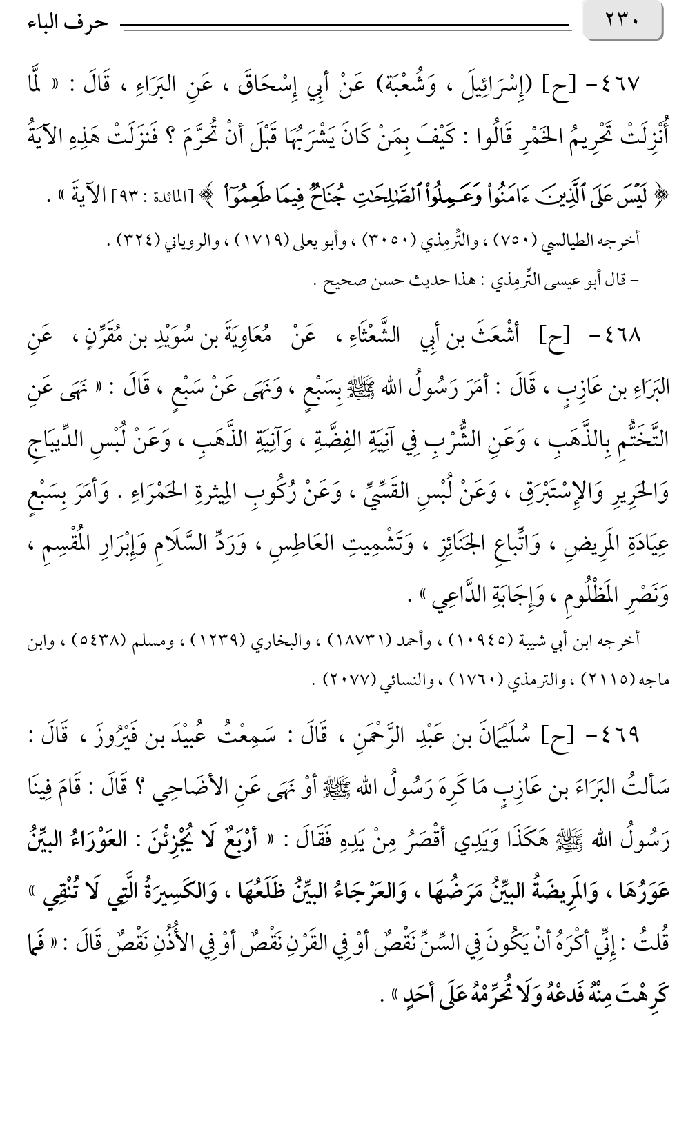 ٤٦٨ - [ح] أشْعَثَ بن أبِي الشَّعْثَاءِ، عَنْ مُعَاوِيَةَ بن سُوَيْدِ بن مُقَرِّنٍ، عَنِ البَرَاءِ بن عَازِبٍ، قَالَ: أمَرَ رَسُولُ الله صلى الله عليه وسلم بِسَبْعٍ، وَنَهَى عَنْ سَبْعٍ، قَالَ: «نَهَى عَنِ التَّخَتُّمِ بِالذَّهَبِ، وَعَنِ الشُّرْبِ فِي آنِيَةِ الفِضَّةِ، وَآنِيَةِ الذَّهَبِ، وَعَنْ لُبْسِ الدِّيبَاجِ وَالحَرِيرِ وَالإِسْتَبْرَقِ، وَعَنْ لُبْسِ القَسِّيِّ، وَعَنْ رُكُوبِ المِيثرةِ الحَمْرَاءِ. وَأمَرَ بِسَبْعٍ عِيَادَةِ المَرِيضِ، وَاتِّباعِ الجَنَائِزِ، وَتَشْمِيتِ العَاطِسِ، وَرَدِّ السَّلَامِ وَإِبْرَارِ المُقْسِمِ، وَنَصْرِ المَظْلُومِ، وَإِجَابَةِ الدَّاعِي».