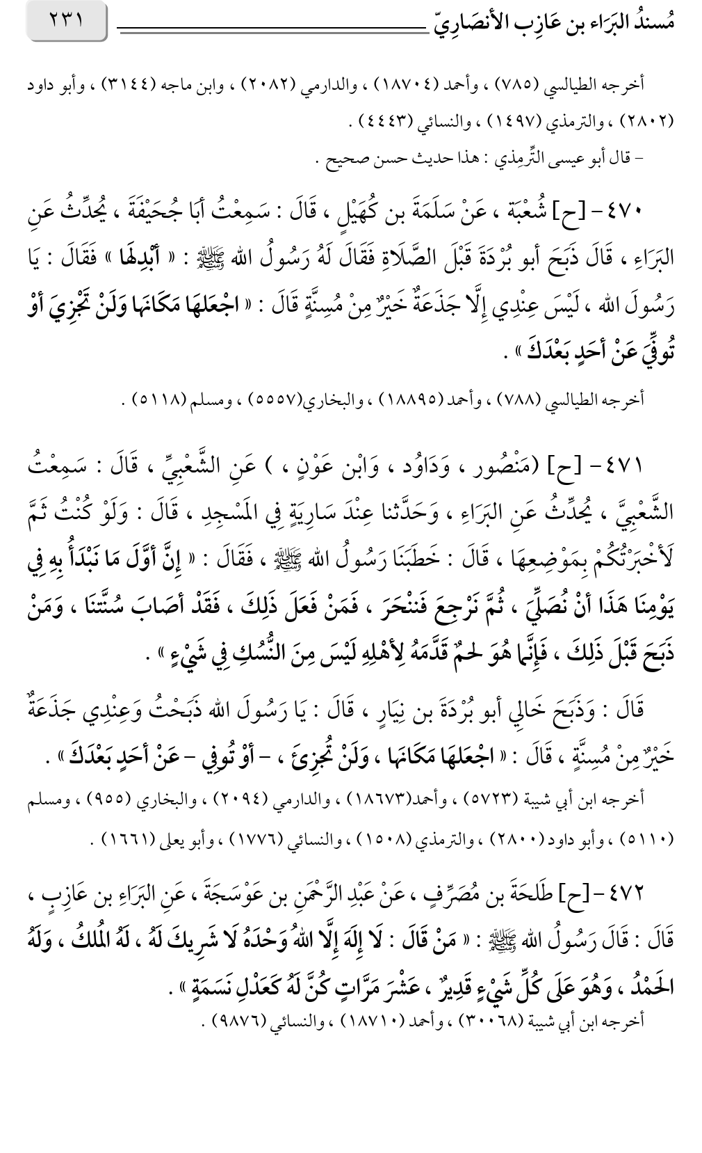 ٤٧٠ - [ح] شُعْبَة، عَنْ سَلَمَةَ بن كُهَيْلٍ، قَالَ: سَمِعْتُ أبَا جُحَيْفَةَ، يُحدِّثُ عَنِ البَرَاءِ، قَالَ ذَبَحَ أبو بُرْدَةَ قَبْلَ الصَّلَاةِ فَقَالَ لَهُ رَسُولُ الله صلى الله عليه وسلم: «أبْدِلَها» فَقَالَ: يَا رَسُولَ الله، لَيْسَ عِنْدِي إِلَّا جَذَعَةٌ خَيْرٌ مِنْ مُسِنَّةٍ قَالَ: «اجْعَلهَا مَكَانَها وَلَنْ تَجْزِيَ أوْ تُوفِّيَ عَنْ أحَدٍ بَعْدَكَ».